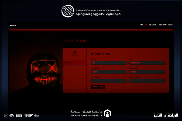 عمون - ضمن تحضيرات كلية العلوم الحاسوبية والمعلوماتية في جامعة عمّان العربية لمسابقة الأمن السيبراني الأولى AAU-CTF 2023 والتي عقدت بمختبرات الكلية بحرم الجامعة على مدار يومين، قام الطالب سعدي عشلق والطالب براء العمري من طلبة مساق مشاريع التخرج بالكلية بتطوير نظام المسابقة بمواصفات عالمية مسخرين كافة المهارات والمعارف التطبيقية التي اكتسبوها أثناء دراستهم من تحليل وتصميم وتطوير برمجيات وبناء أنظمة حماية وتشفير للبيانات، الأمر الذي مكن القائمين على المسابقة من إدارتها بالشكل الأنسب ومكنتهم من إضافة الأسئلة وتقسيمها إلى فئات مختلفة وإنشاء الحسابات واحتساب العلامات وإعلان النتائج بدقة وبشكل مباشر وفقاً لمستوى ومدة الحل، وقد شمل النظام لوحة تحكم Dashboard متكاملة تضمنت شاشات لإظهار تقدم المتسابقين وإعلان النتائج بالوقت الحقيقي Real-time وتشفير الإجابات Flag لزيادة الحماية، كما وتضمن النظام شاشات خاصة بالمشروفين Admins لإعداد الحسابات وإدارة كافة جوانب المسابقة من بدايتها ولحين إعلان النتائج، كما وتم تعزيز النظام بتقارير متنوعة تم الاستفادة منها خلال كافة مراحل المسابقة متضمنة رسومات بيانية وإحصائية.