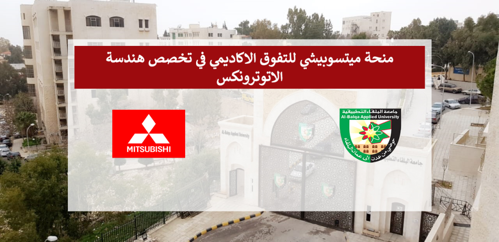 تعلن جامعة البلقاء التطبيقية عن فتح باب الترشيح لطلبة كلية الهندسة التكنولوجية قسم الميكانيك تخصص اتوترونكس لمنحة مؤسسة ميتسوبيشي (طالبين فقط) والتي توفر للطالب تحمل كافة الرسوم الدراسية ومصروف شهري على ان يكون الطالب من المتفوقين أكاديميا ومسجل في الكلية وعلى مقاعد الدراسة للفصل الأول للعام الجامعي 23/24 ويشترط للتقدم للحصول على المنحة ما يلي: