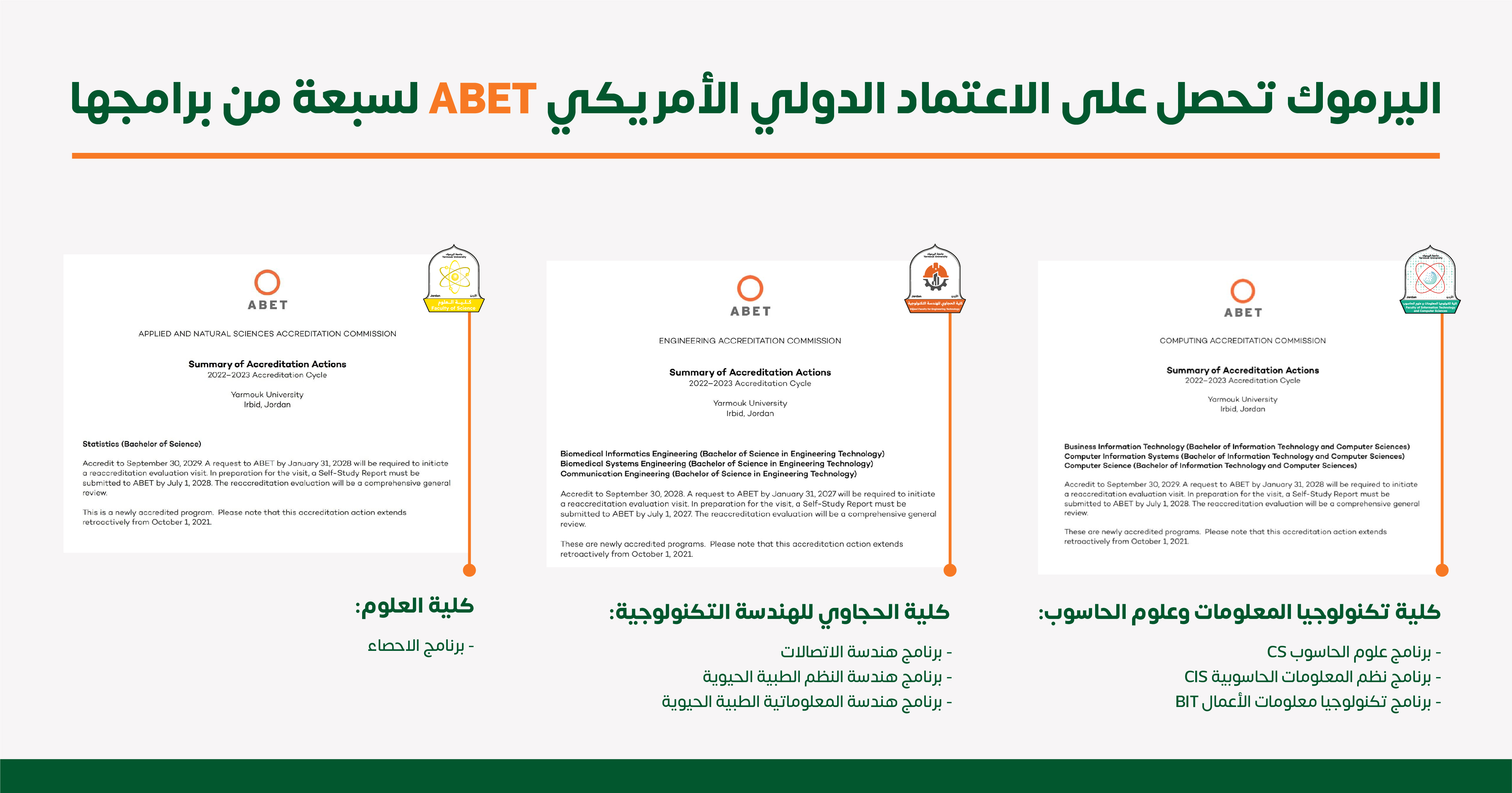 تستمر جامعة اليرموك بتحقيق انجازاتها على المستوى العلمي والأكاديمي، وذلك ضمن عمليات التطوير والتحديث النهضوي التي تسيربها الجامعة بخطى ثابتة لتحقيق التميز والتقدم على المستوى المحلي والاقليمي والدولي على حد سواء، وبما ينسجم مع رؤية التحديث الاقتصادي للدولة الأردنية، حيث تم الاعلان الرسمي أمس عن حصول الجامعة على الاعتماد الدولي الأمريكي ABET وبالمدة القصوى لسبعة من برامجها لمرحلة البكالوريوس في كليات تكنولوجيا المعلومات وعلوم الحاسوب، وكلية الحجاوي للهندسة التكنولوجية، وقسم الاحصاء في كلية العلوم.