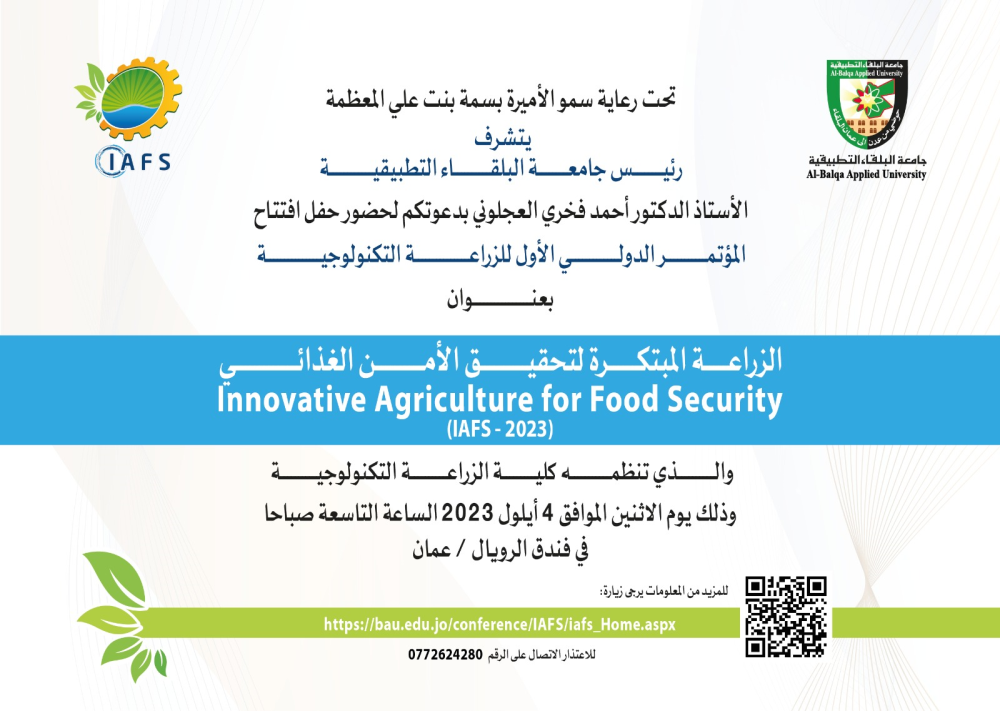 جامعة البلقاء التطبيقية دعوة لحضور حفل افتتاح المؤتمر الدولي الأول للزراعة التكنولوجية بعنوان الزراعة المبتكرة لتحقيق الأمن الغذائي (Innovative Agriculture for Food Security (IAFS-2023