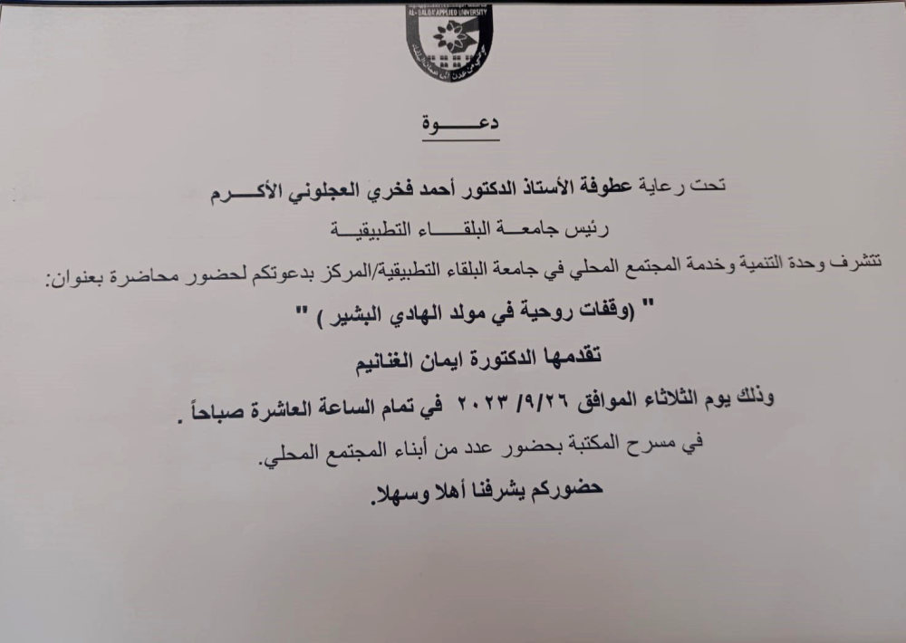 المشاركة في الفيسبوك || المشاركة في تويتر دعوة لحضور محاضرة بعنوان وقفات روحية في مولد الهادي البشير 2023/09/24 19:42 دعوة لحضور محاضرة بعنوان وقفات روحية في مولد الهادي البشير أخبار الجامعات أخبار الجامعات اخبار جامعة البلقاء التطبيقية
