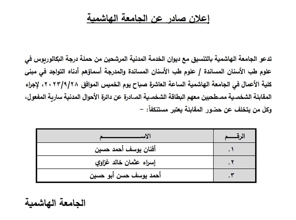 المشاركة في الفيسبوك || المشاركة في تويتر إعلان صادر عن وحدة الموارد البشرية الجامعة الهاشمية 2023/09/25 14:25 إعلان صادر عن وحدة الموارد البشرية أخبار الجامعات أخبار الجامعات اخبار الجامعة الهاشمية