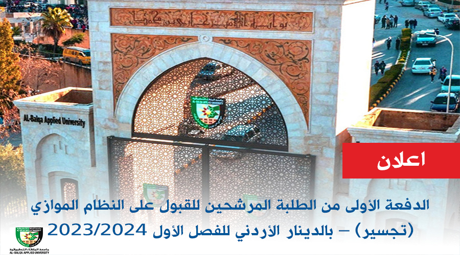 يعلن المسجل العام في جامعة البلقاء التطبيقية للطلبة المرشحين للقبول على النظام الموازي بالدينار الأردني (التجسير) في جميع تخصصات برنامج البكالوريوس ضمن الدفعة الأولى الذين استلموا رسائل (SMS) تفيد بقبولهم من جامعة البلقاء التطبيقية و استكمال عملية الدفع الالكتروني والحصول على الرقم الجامعي وذلك على الفصل الدراسي الأول 2023-2024 و حتى نهاية دوام يوم الأحد الموافق 2023/10/1، علماً بأنه لن يتم استقبال أي طالب لم يقم باستكمال إجراءات قبوله بعد ذلك التاريخ، وإلا يعتبر مستنكفا وفاقدا لمقعده. خطوات استكمال إجراءات القبول الالكتروني : 1- يتوجب على الطالب تسديد الرسوم المطلوبة كاملةً لدى أي فرع من فروع البنوك العاملة في الأردن التي توفر خدمة الدفع الإلكتروني إي-فواتيركم (eFAWATEERcom) خلال 24 ساعة من تقديم الطلب باستخدام رقمه الوطني وإلا يعتبر طلبه لاغياً. 2- ستصل للطالب (2) رسالتان نصية (SMS) على رقم الهاتف المعتمد للطالب أثناء استكمال القبول. • الرسالة الأولى (SMS1) : تتضمن قيمة الرسوم الدراسية المطلوب دفعها من قبل الطالب من خلال خدمة الدفع الالكتروني اي فواتيركم. • الرسالة الثانية (SMS2) : تتضمن الرقم الجامعي للطالب وكلمة السر، وكذلك البريد الالكتروني للطالب وكلمة السر له.