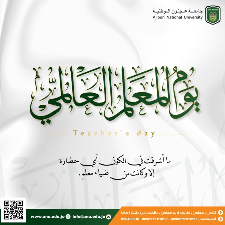 تتقدم أسرة جامعة عجلون الوطنية ممثلة برئيسها الأستاذ الدكتور فراس الهناندة وأعضاء الهيئتين الأكاديمية والتدريسية والطلبة للتربويين والتربويات والمعلمين والمعلمات بأجمل التهاني وأطيب الأماني والتبريكات للمعلمين المخلصين وعرفاناً بفضلهم الجليل بمناسبة يوم المعلم