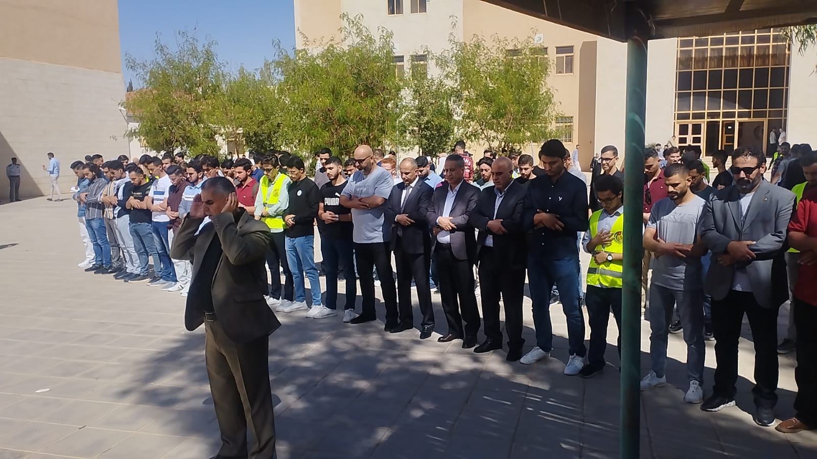 وفي الختام ادى المشاركون وبحضور جمع من اعضاء الهيئة التدريسية والإدارية والطلبة صلاة الغائب على ارواح الشهداء الذين ارتقوا دفاعا عن ارضهم وحقوقهم المشروعة.