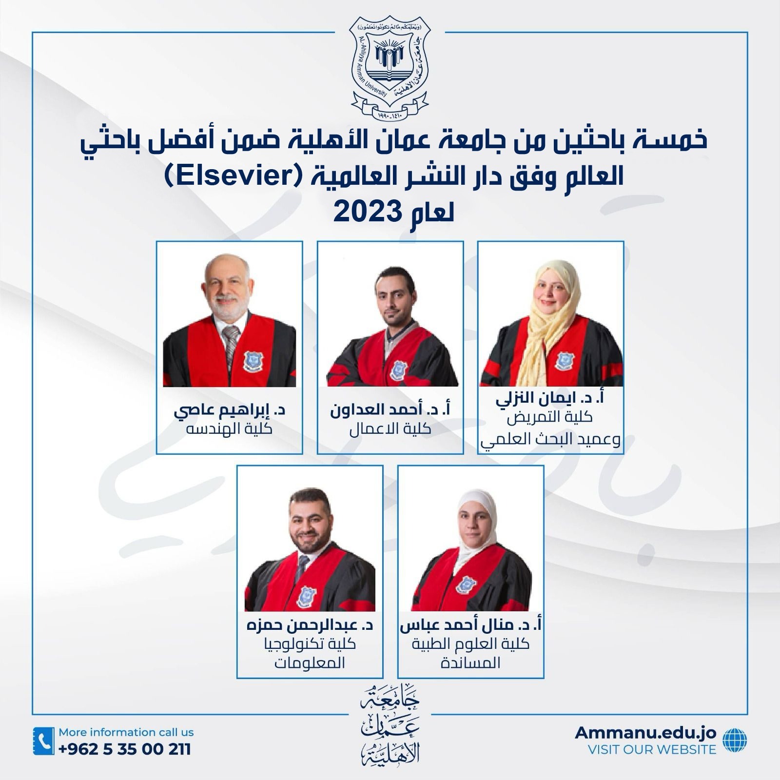 صنف خمسة باحثين من جامعة عمان الأهلية في قائمة أفضل 2% من الباحثين على مستوى العالم حسب قاعدة بيانات الباحثين العلمية المحدّثة لمؤشر الاقتباس وفقاً لدراسة صادرة عن جامعة ستانفورد الأمريكية للعام 2023 تحت عنوان Updated science-wide author databases of standardized citation indicators وهم • الأستاذ الدكتور ايمان النزلي كلية التمريض وعميد البحث العلمي • الأستاذ الدكتور منال أحمد عباس كلية العلوم الطبية المساندة • الدكتورعبدالرحمن حمزة كلية تكنولوجيا المعلومات • الأستاذ الدكتور أحمد صامد العدوان كلية الأعمال • الدكتور ابراهيم عاصي كلية الهندسة. وهذا التصنيف يصدر سنوياً طبقاً لدراسة يجريها مجموعة من العلماء في جامعة ستانفورد الأميركية العريقة، حيث يعرف في الوسط الأكاديمي بإسم تصنيف ستانفورد. وشملت الدراسة أكثر من ١٠٠٠٠٠ عالم حول العالم، واعتمدت الدراسة في التقريرعلى المعلومات المتوفرة في قاعدة البيانات Scopus ودار النشر العالمية Elsevier وتشمل مجموعة من المعايير المهمة منها عدد الأبحاث المنشورة في المجلات العلمية الرصينة والمفهرسة ايضاً في قواعد البيانات العالمية Scopus and Web of Science وعدد الاقتباسات لكل ورقة علمية مفهرسة في قواعد البيانات وعدد الاستشهادات العلمية للأبحاث والباحثين، بالإضافة إلى جودة الأبحاث المنشورة والتي تحل مشاكل مهمة ومتعددة. رابط التصنيف https://elsevier.digitalcommonsdata.com/datasets/btchxktzyw/6