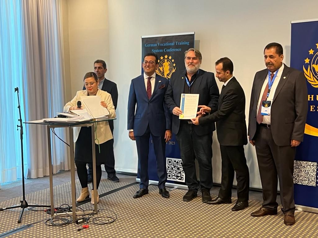 جاء ذلك خلال اجتماع عقده الجانبان، على هامش انعقاد المؤتمر الدولي التاسع (منح الإعتماد الألماني في التعليم والتدريب والتوظيف)، في اطار البرنامج الدولي 2023 (حسب معايير الاتحاد الأوروبي)، والذي ينعقد في العاصمة الألمانية برلين.