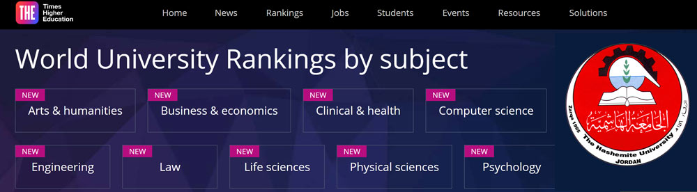 أحرزت الجامعة الهاشمية تقدمًا ملحوظًا في تصنيف التايمز العالمي حسب المجال المعرفي/التخصص للعام 2024 (Times Higher Education Subject Ranking). حيث تصدرت مراكز متقدمة في عدة مجالات، بما في ذلك:
