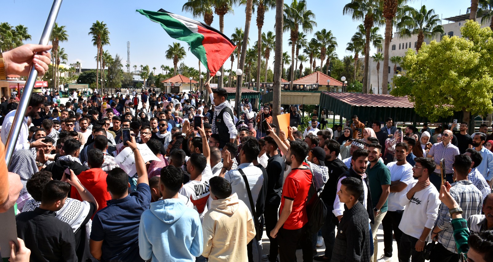 وهتف طلبة الجامعة والحضور خلال الوقفة بهتافات أكدت على ضرورة ايقاف سياسة القتل الوحشية التي يرتكبها العدو ضد اهلنا في غزة، واشادوا بمواقف جلالة الملك تجاه فلسطين واهلها المرابطين الصامدين في وجه الإحتلال، ورفعوا أعلام الأردن وفلسطين.