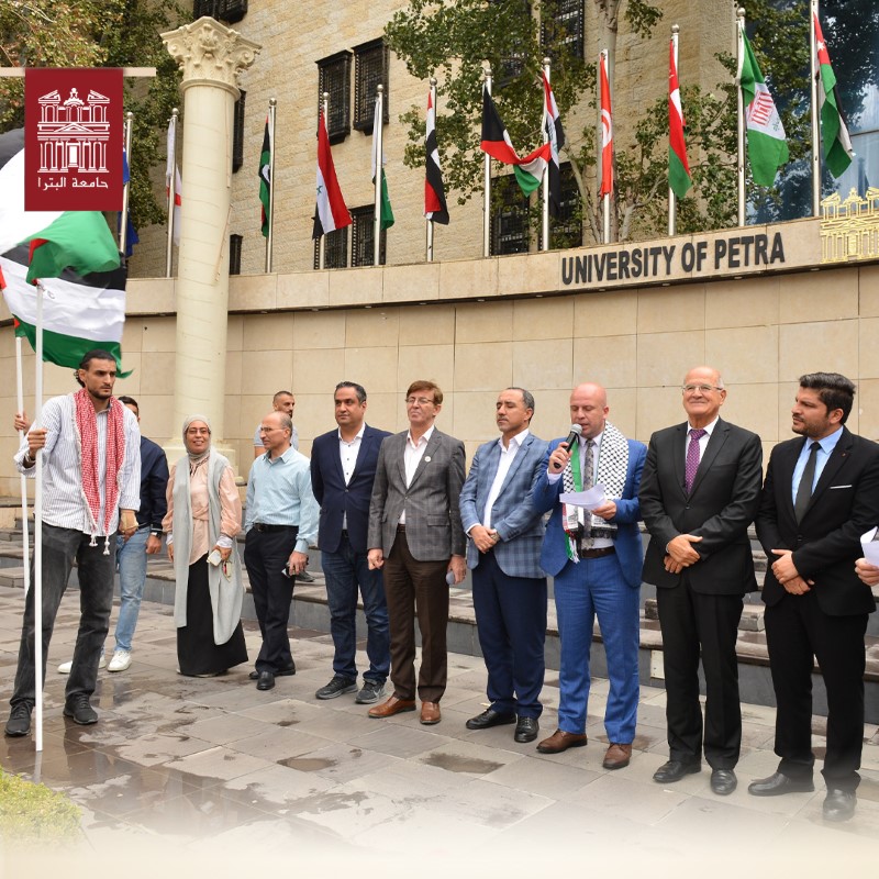 وقال عميد شؤون الطلبة الدكتور إياد الملاح: "إن أسرة جامعة البترا تقف اليوم دعمًا لصمود إخواننا في فلسطين وفي قطاع غزة، لنؤكد التلاحم بين الشعبين الأردني والفلسطيني، ونؤكد التفافنا خلف قيادتنا الهاشمية الحكيمة، وخطوات جلالة الملك عبد الله الثاني بن الحسين حفظه الله ورعاه في دعم القضية الفلسطينية، وجهوده الساعية الى إنهاء معاناة أهلنا في قطاع غزة".