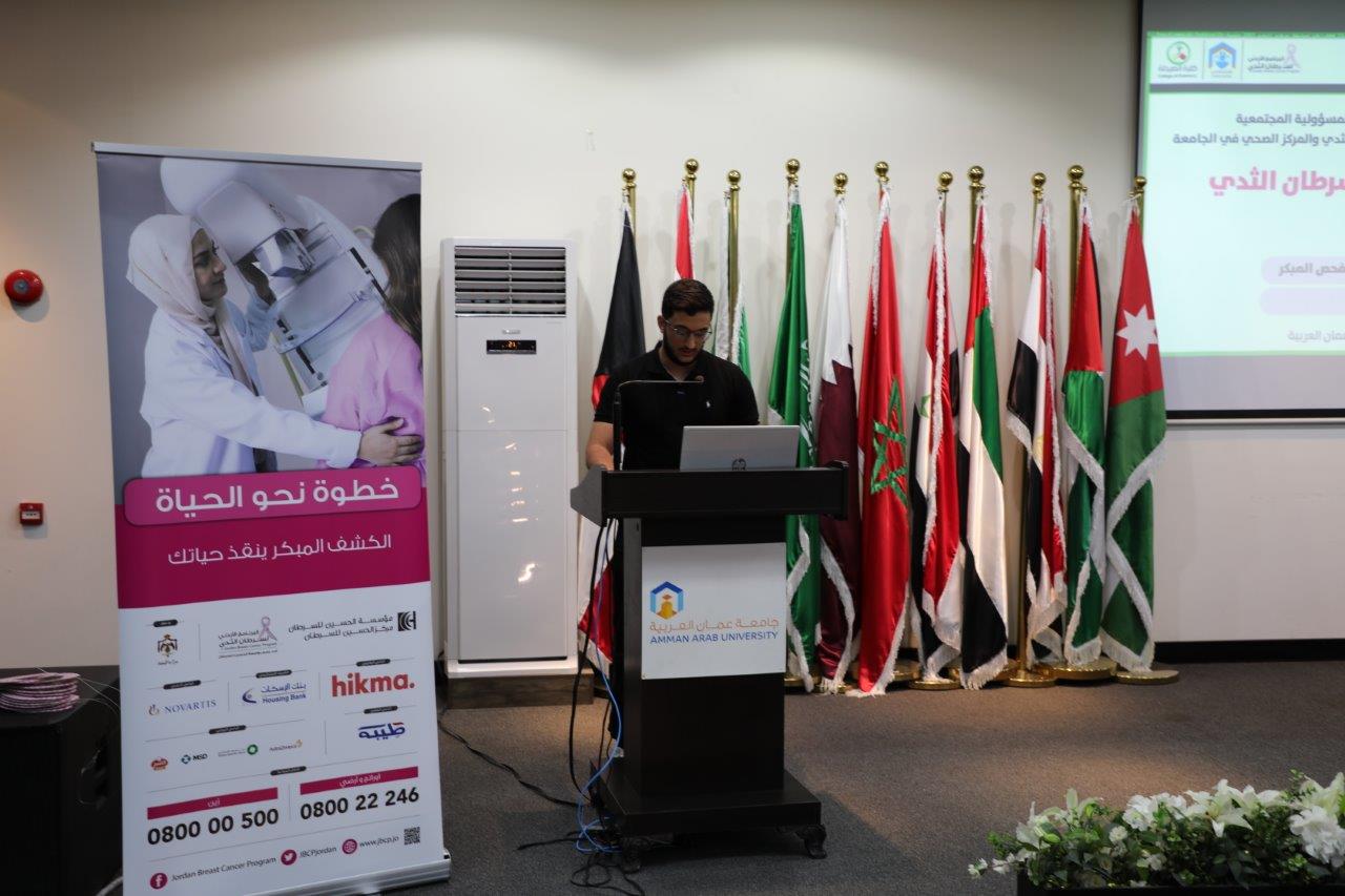 انطلاقاً من المسؤولية المجتمعية لجامعة عمان العربية نظمت كلية الصيدلة وبالتعاون مع المركز الصحي في الجامعة والبرنامج الأردني لسرطان الثدي التابع لمؤسسة الحسين للسرطان، يوماً توعوياً بسرطان الثدي تحت عنوان (خطوة نحو الحياة...افحصي).