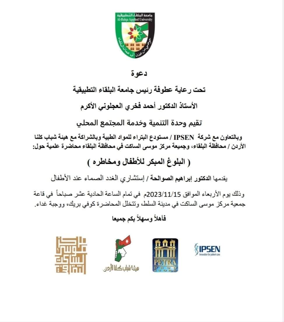 المشاركة في الفيسبوك || المشاركة في تويتر دعوة لحضور محاضرة البلوغ المبكر عند الأطفال ومخاطره 2023/11/13 13:23 دعوة لحضور محاضرة البلوغ المبكر عند الأطفال ومخاطره أخبار الجامعات اخبار جامعة البلقاء التطبيقية