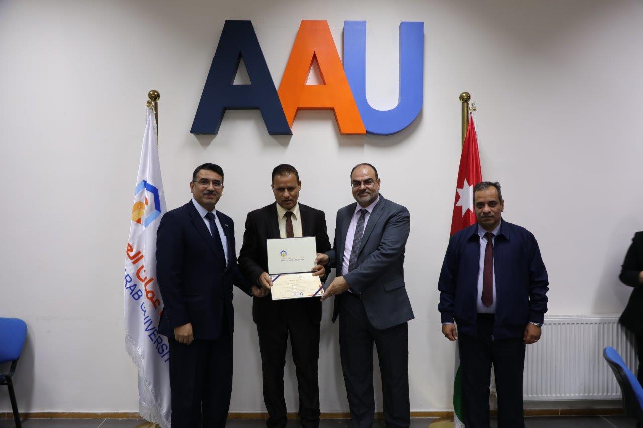 عمان – ضمن استكمال فعاليات الورش التدريبية الخاصة بأعضاء الهيئة التدريسية في جامعة عمان العربية وبإشراف من دائرة التطوير الأكاديمي في الجامعة ومندوباً عن رئيس الجامعة الأستاذ الدكتور محمد الوديان كرّم الأستاذ الدكتور إسماعيل يامين مساعد رئيس الجامعة للشؤون الأكاديمية مدربي الورش التدريبية للفصل الدراسي الأول من العام الجامعي 2023-2024 وبحضور كّل من الدكتور حسام الحمد مساعد الرئيس للتخطيط وضمان الجودة والدكتور أحمد الحسبان مدير مركز التطوير الأكاديمي وضمان الجودة.
