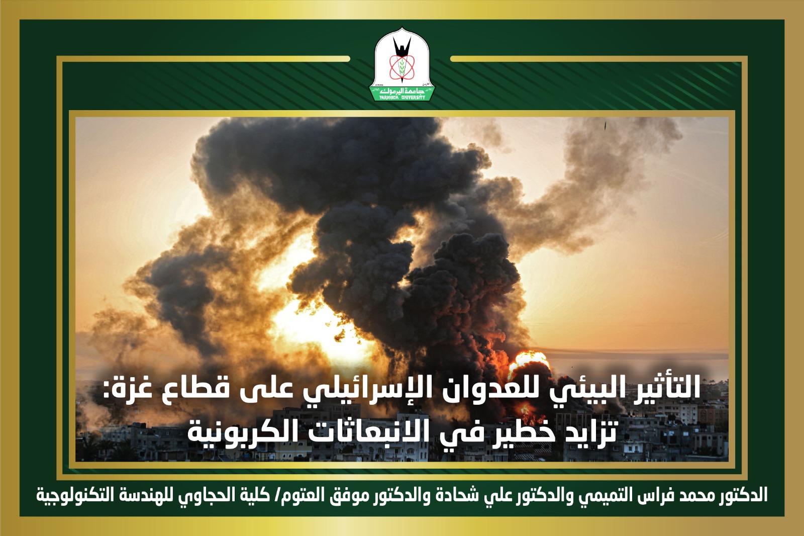 أوجد التعقيد والتصعيد في الآونة الأخيرة ضرورة للبحث في الأثر البيئي الناتج عن العمليات العسكرية الاسرائيلية المكثفة على قطاع غزة، واتضح خلال تحليل مفصل أنها ليست مصدر قلق إنساني عميق فقط، إنما تُشكل أيضا مسألة بيئية هامة وذات خطورة عالية؛ وذلك وفقا لتقييم أجراه ثلاثة من أعضاء الهيئة التدريسية في كلية الحجاوي للهندسة التكنولوجية (د. محمد فراس التميمي، ود. علي شحاده، وأ. د. موفق عتوم) والذي أُجريَّ بعد 35 يوما من تصاعد الصراع. إذ تم تقدير انبعاثات بمقدار 60.304 مليون طن تقريبا من مكافئات ثاني أكسيد الكربون. وهذا الرقم يشمل مجموعة مصادر؛ بما فيها استهلاك الوقود، والذخائر، وثلاثي نتروتولوين (TNT)، وهدم المباني، وإعادة بناء البنية التحتية المدنية.