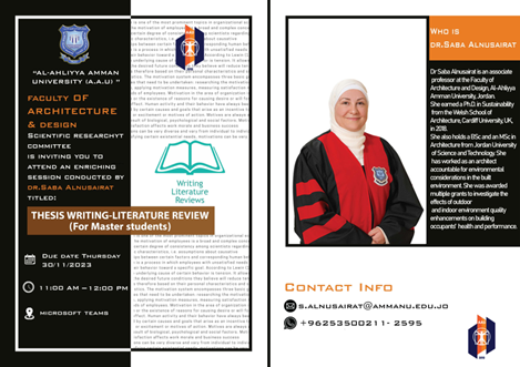 تتواصل فعاليات الموسم العلمي لكلية العمارة والتصميم بعقد ورشة عن كتابة رسائل الماجستير لطلبة الدراسات العليا / مسار الماجستير في قسم التصميم الداخلي، بعنوان: Thesis Writing- Literature Review (for Master Students) قدمتها الدكتورة صبا نصيرات عميدة الكلية، وذلك يوم الخميس الموافق 30/11/2023، ركزت الورشة على الأساليب العلمية لكتابة أدبيات البحث، واستهدفت رفع مهارات طلبة الدراسات العليا في الكلية في كتابة رسائلهم الجامعية، وشارك في حضور الورشة أعضاء الهيئة التدريسية وطلبة الدراسات العليا في قسم التصميم الداخلي. وتأتي هذه الورشة ضمن سلسلة المحاضرات والورش التي تقيمها الكلية ضمن الموسم العلمي الذي انطلقت فعالياته مع بداية العام الجامعي 2023-2024، بإشراف لجنة البحث العلمي على مستوى الكلية، بهدف التواصل وتبادل الخبرات بين أعضاء الهيئة التدريسية في الكلية من جانب، وبينهم وبين الطلبة من جانب آخر، تماشياً مع سياسة الجامعة والكلية وقيمهما الجوهرية.