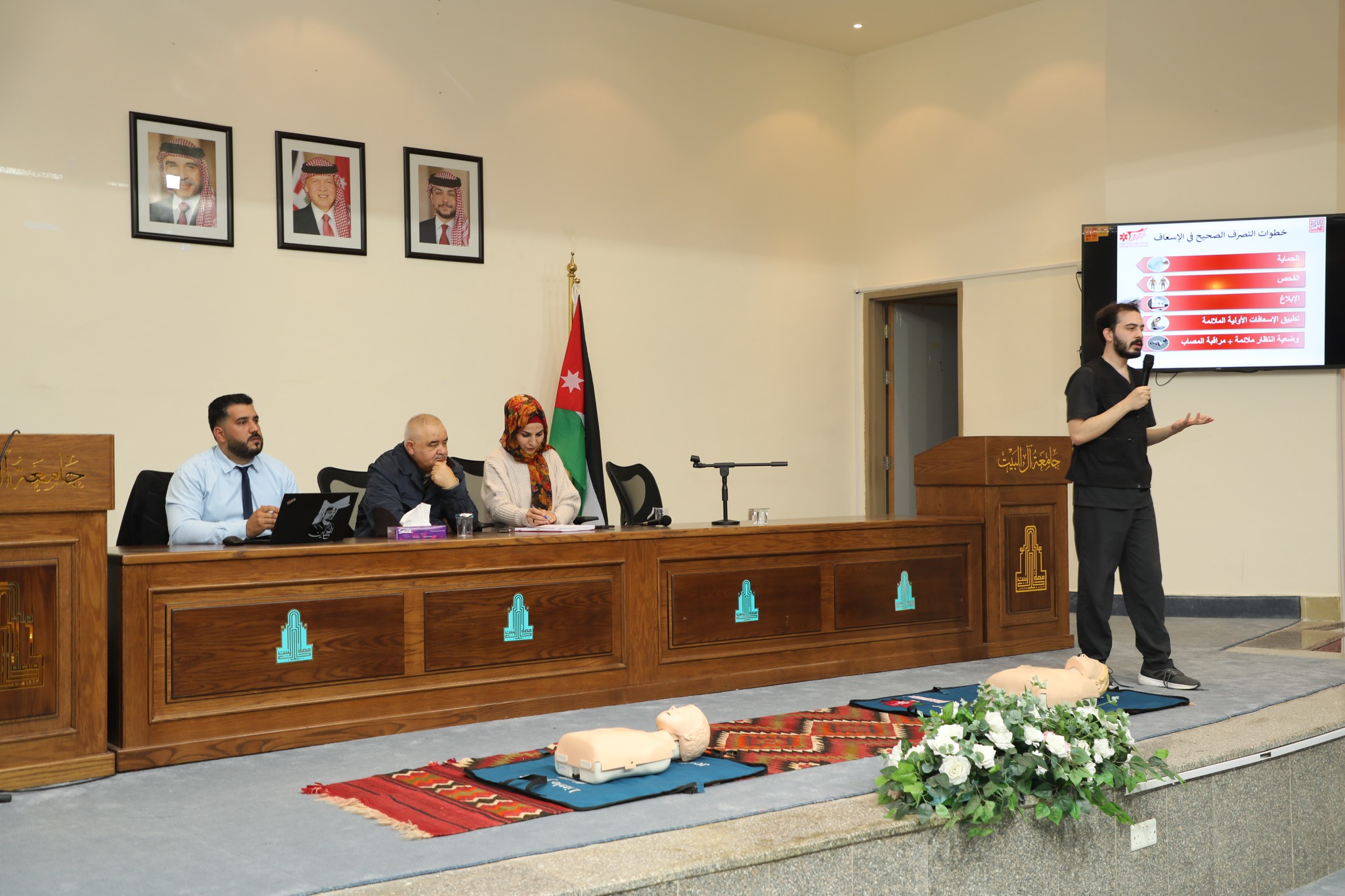 الدكتور حمزة الشيخ سالم من الجمعية الأردنية للإسعاف قدم شرحاً موجزاً وتدريباً عن بالإسعاف الأولي وأهداف الإسعاف وأنواعه وكيفية تقديم المساعدة اللازمة للمصابين ، وأستعرض الإصابات اليومية التي تحدث مثل النزيف والكسور والحروق ، وآلية الانعاش القلبي والرئوي وكيفية التعامل مع حالات الاختناق والتسمم كما قام بالتعريف بالإسعاف الأولي من خلال التدريب والتطبيق العملي أمام الحضور.