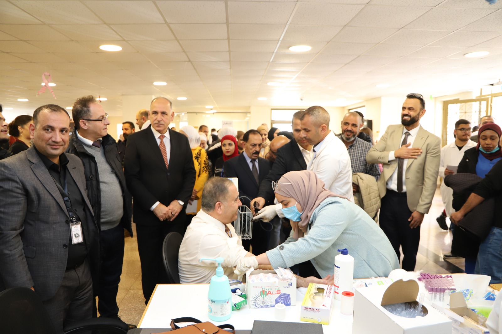 مندوبا عن رئيس جامعة البلقاء التطبيقية الاستاذ الدكتور احمد فخري العجلوني رعى نائب الرئيس لشؤون الكليات الاستاذ الدكتور زكريا القضاة حملة للتبرع بالدم والتي نظمتها وحدة التنمية وخدمة المجتمع المحلي بالتعاون مع وحدة التأمين الطبي وكليتي التمريض والعلوم ومستشفى الشونة الجنوبية بحضور عميد كلية التمريض الدكتور لورنس الحديد ومدير وحدة التنمية وخدمة المجتمع المحلي الاستاذ الدكتور غالب عربيات ونائب مدير مستشفى الشونة الجنوبية الدكتور محمد الخرابشة.
