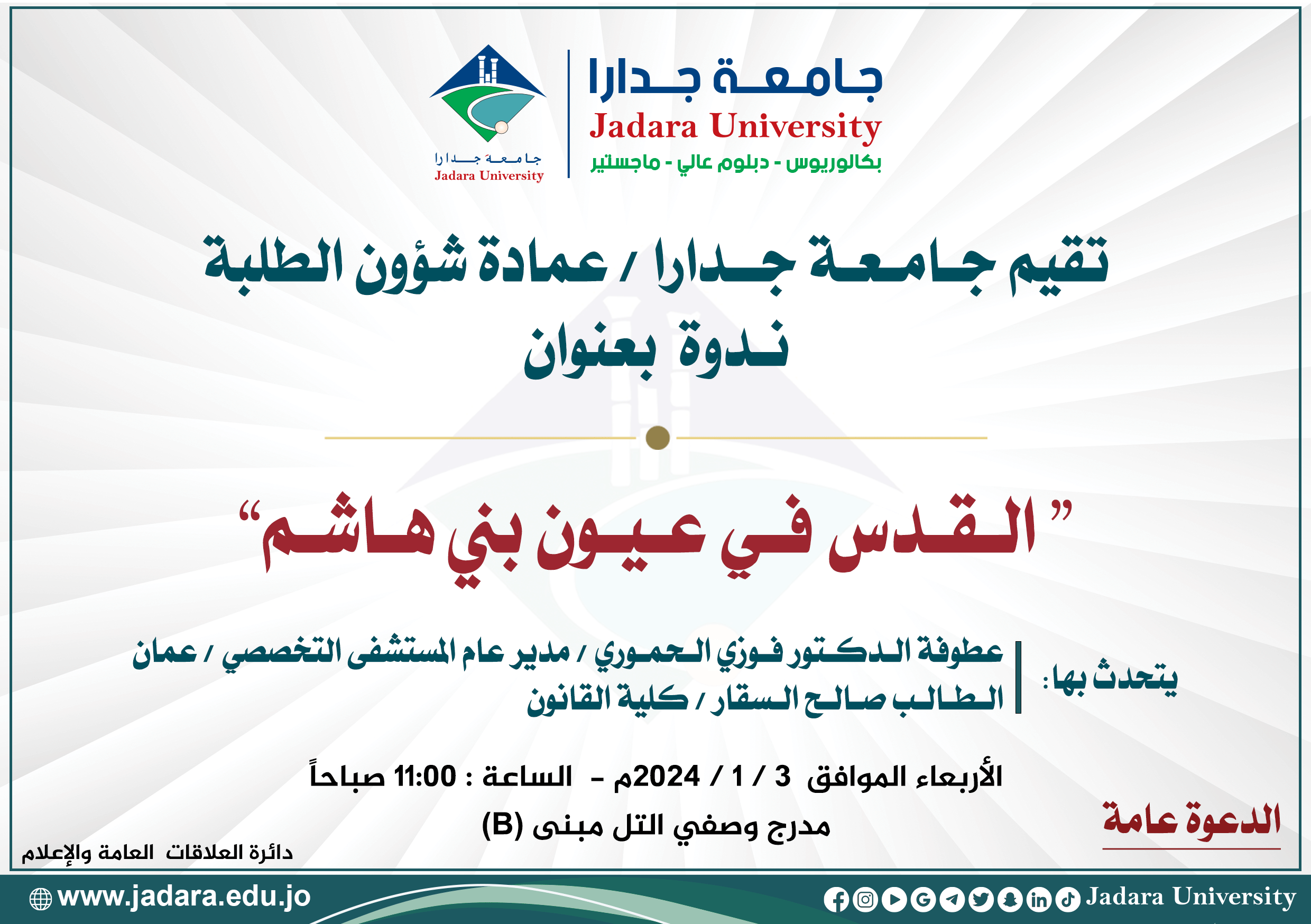 تقيم جـامـعـة جــدارا / عمادة شؤون الطلبة نـدوة بعنوان "القدس بعيون بني هاشم"