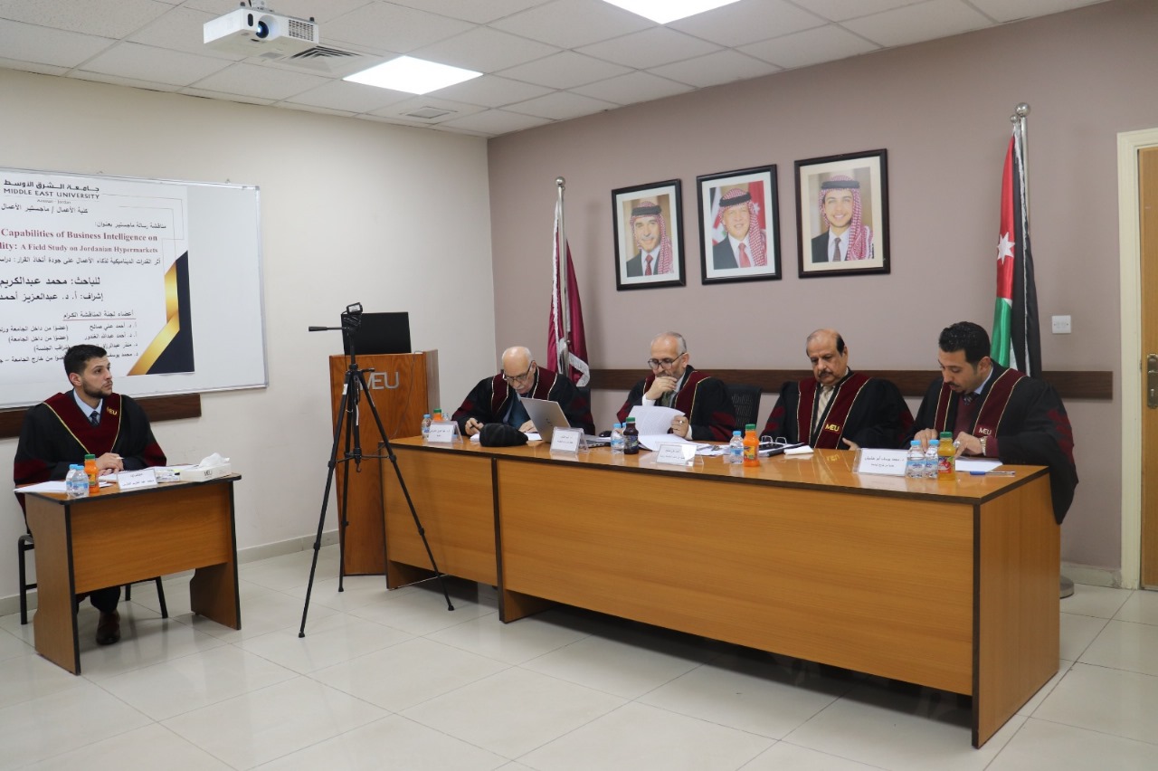 نوقشت في كلية الأعمال بجامعة الشرق الأوسط، رسالة ماجستير بعنوان “أثر القدرات الديناميكية لذكاء الأعمال على جودة اتخاذ القرار: دراسة ميدانية على الهايبر ماركت الأردنية “للباحث محمد عبد الكريم الفارس.