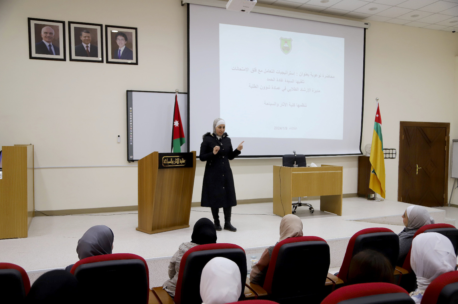 أخبار الجامعة الأردنية (أ ج أ) قصي الطراونة - ضمن محاضراتها التوعوية المُقدّمة للطلبة، نظمت كلية الآثار والسياحة في الجامعة الأردنيّة محاضرة بعنوان "استراتيجيات التعامل مع قلق الامتحانات"، قدمتها مديرة دائرة الإرشاد الطلابي في عمادة شؤون الطلبة غادة الحمد.
