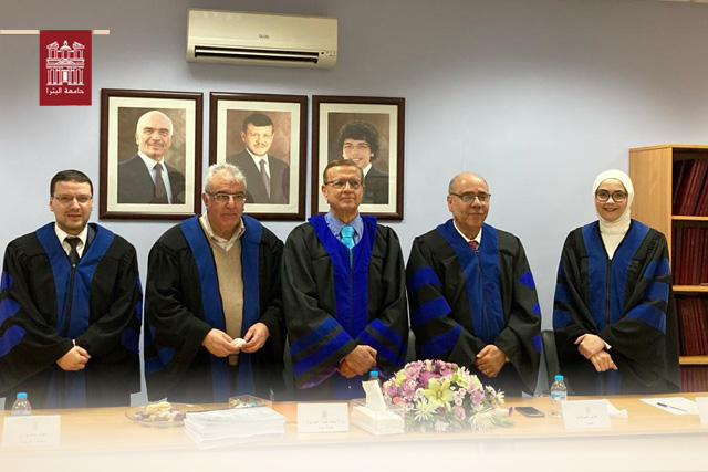 وتكونت لجنة المناقشة من الأستاذ الدكتور محمد نجيب الصرايرة مشرفا ورئيسا، وعضوية كل من الأستاذ الدكتور علي نجادات والدكتورة رنا العمري ممتحنين داخليين والدكتور أمجد صفوري من جامعة الزرقاء ممتحنا خارجيا.
