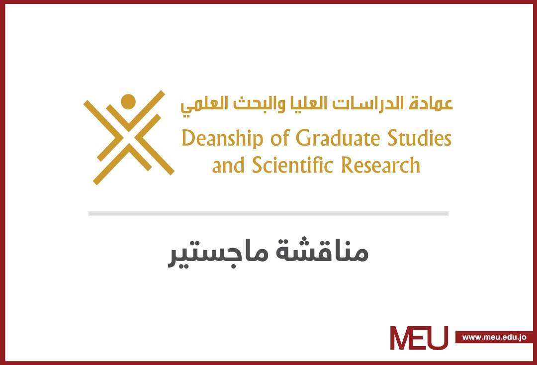 وتألفت لجنة المناقشة من؛ الدكتور مأمون احمد الحنيطي مشرفاً، والدكتور ياسين أحمد القضاة عضواً داخلياً ورئيساً، والدكتور حازم علي النسور عضوا داخلياً، والأستاذ الدكتور محمد خليل أبو بكر عضواً خارجياً، والدكتورة ليلى أحمد جرار مراقباً للجلسة.