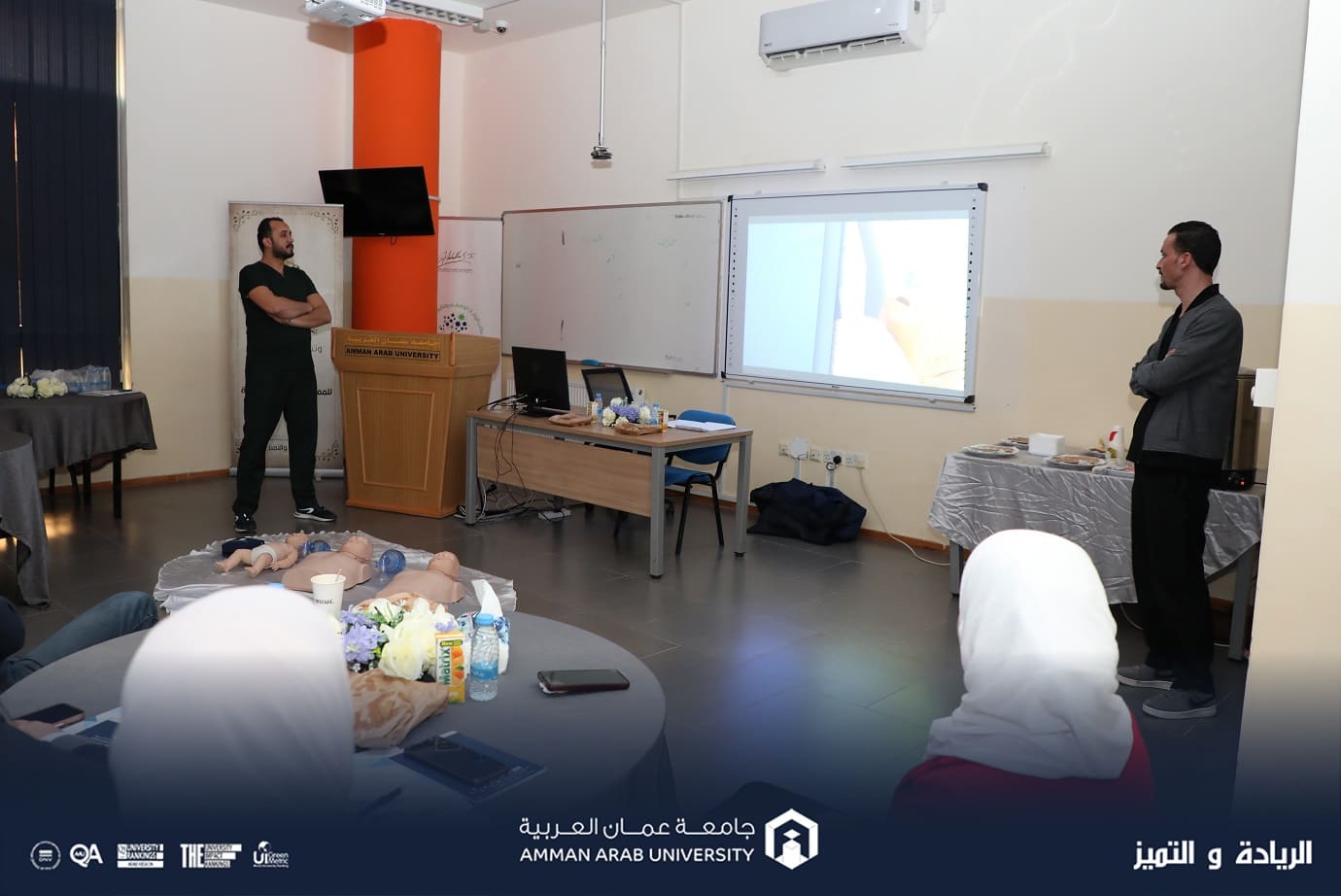 انطلاقًا من رؤية جامعة عمان العربية نحو الريادة والتميز وتعزيزاً لدور كلية الصيدلة في الجامعة في تحقيق التنمية المستدامة والارتقاء بصحة المجتمع، وإضافة إلى حاجة الجامعة والمجتمع المحيط بها إلى الخدمات الصحية الفعالة والمتكاملة، عقدت كلية الصيدلة في جامعة عمان العربية فعاليات الورشة التدريبية الرابعة لدعم الحياة الأساسي والانعاش القلبي والتنفسي وذلك بالتنسيق مع أكاديمية زراع الأمل، وبحضور كل من المدربين صالح خطاطبة ومحمد قباجه، حيث شهدت الدورة مشاركات واسعة من كليات الجامعة من أعضاء هيئة تدريسية وإدارية وطلبة كليات الجامعة المختلفة.