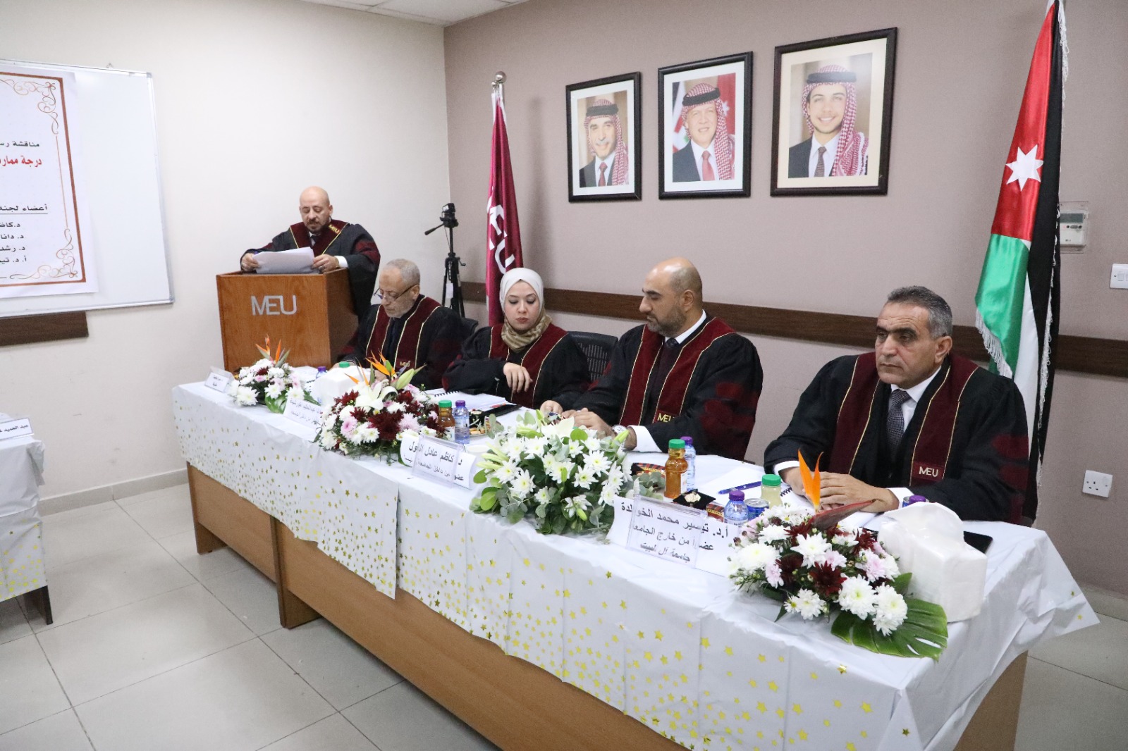 وتألفت لجنة المناقشة من الدكتور عمر الرفايعه مشرفاً، والدكتور كاظم الغول عضواً داخلياً ورئيساً، والدكتورة دانا اخورشيدة عضواً داخلياً، والأستاذ الدكتور تيسير محمد الخوالده عضواً خارجياً، والدكتور رشدان سليمان الرشدان مراقباً للجلسة