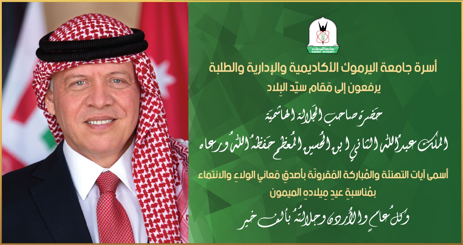 تتشرف كل من رئيس مجلس أمناء جامعة اليرموك الدكتورة رويدا المعايطة وأعضاء المجلس، ورئيس جامعة اليرموك الدكتور إسلام مسّاد، وأعضاء الهيئتين التدريسية والإدارية والطلبة، بأن يرفعوا إلى مقام جلالة الملك عبد الله الثاني ابن الحسين المعظم، خالص عبارات التهنئة والمباركة السعيدة، بمناسبة عيد ميلاده الميمون الـ 62، داعين العلي القدير أن يُعيده على جلالته والأسرة الأردنية الواحدة بالعز والفخار.