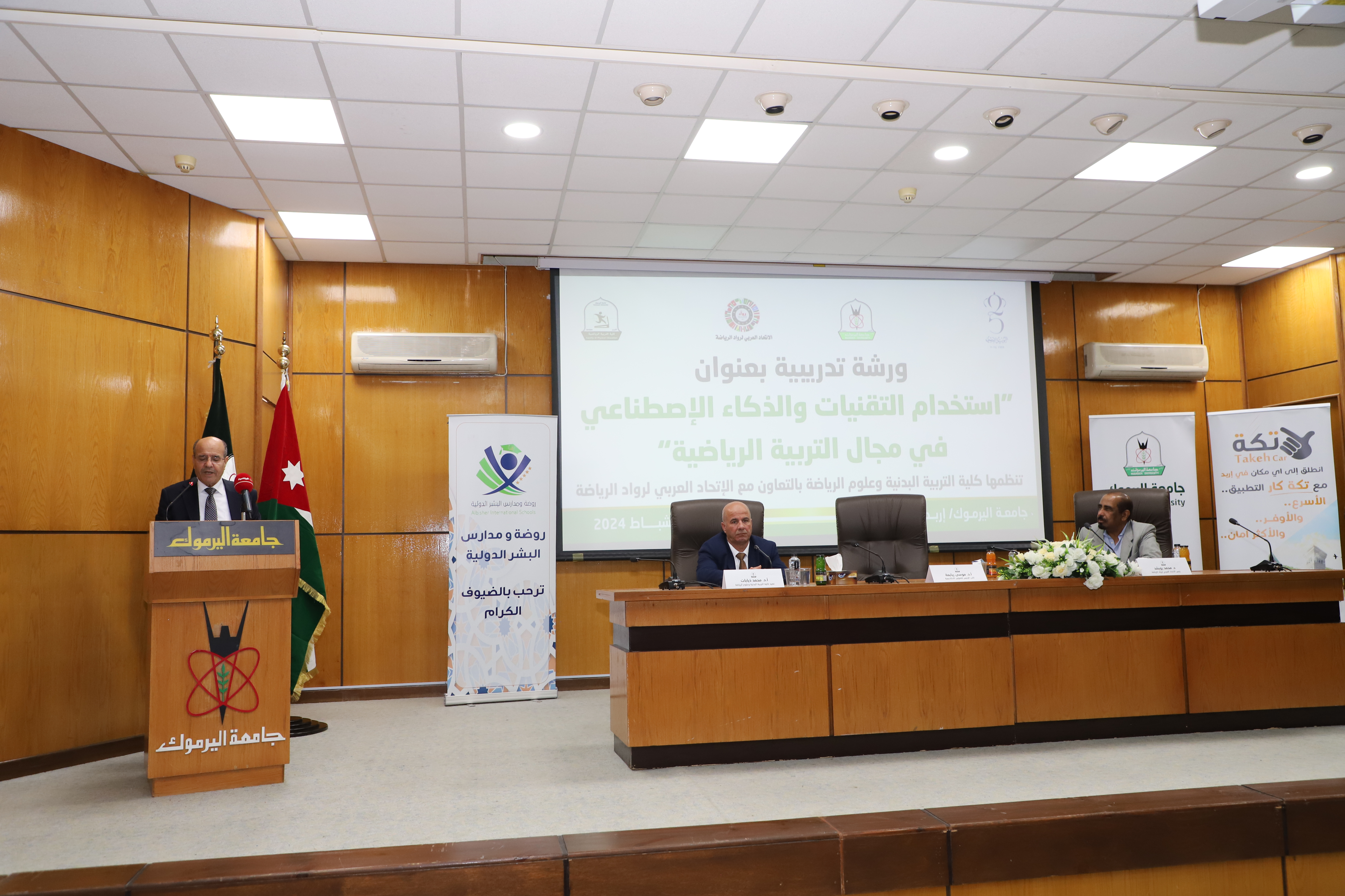 رعى نائب رئيس جامعة اليرموك للشؤون الأكاديمية الدكتور موسى ربابعة، الورشة التدريبية التي نظمتها كلية التربية البدنية وعلوم الرياضة، حول استخدام التقنيات والذكاء الاصطناعي في مجال التربية الرياضية، بالتعاون مع الاتحاد العربي لرواد الرياضة، في مبنى المؤتمرات والندوات، بحضور رئيس الاتحاد العربي لرواد الرياضة الدكتور محمد الرويشد.