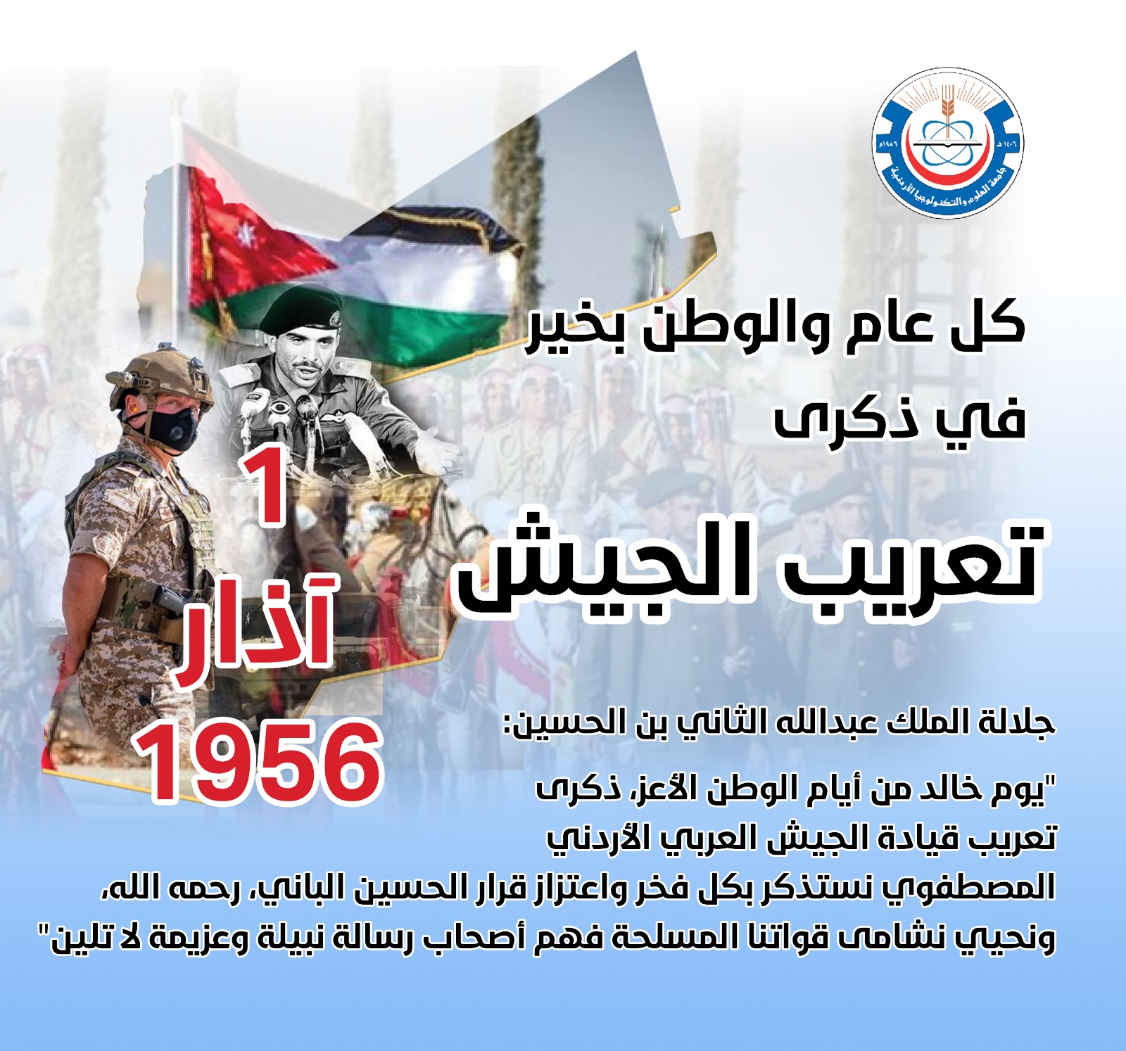 في هذه المناسبة تعود بنا ذاكرة الوطن إلى يومٍ من أيامِ المجدِ والكرامةِ والحرية، مناسبةٌ لم تكن حدثًا وطنيًا عابرًا، فقد أسست بجهود الحسين الباني طيبَ الله ثراه قاعدة وطنية من العسكريين الشرفاء، وشكلت نقطةَ تحولٍ في مسيرةِ جيشنا العربي المصطفوي.