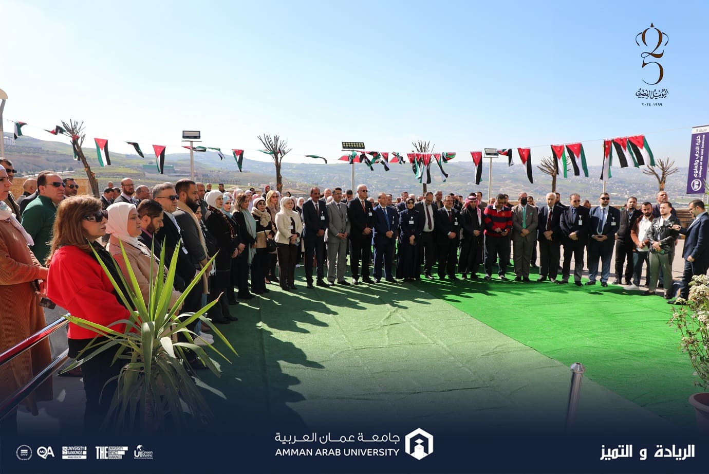 أقامت جامعة عمان العربية احتفالاً برفع علم اليوبيل الفضي وذلك بمناسبة مرور (25) عاماً على تسلّم جلالة الملك عبد الله الثاني ابن الحسين – حفظه الله سلطاته الدستورية وذلك خلال الحفل الذي رعاه الأستاذ الدكتور محمد الوديان رئيس الجامعة وبحضور مساعدي الرئيس وعمداء الكليات ومدراء الوحدات الإدارية وأعضاء الهيئتين التدريسية والإدارية وطلبة الجامعة، وذلك بتنظيم من عمادة شؤون الطلبة.