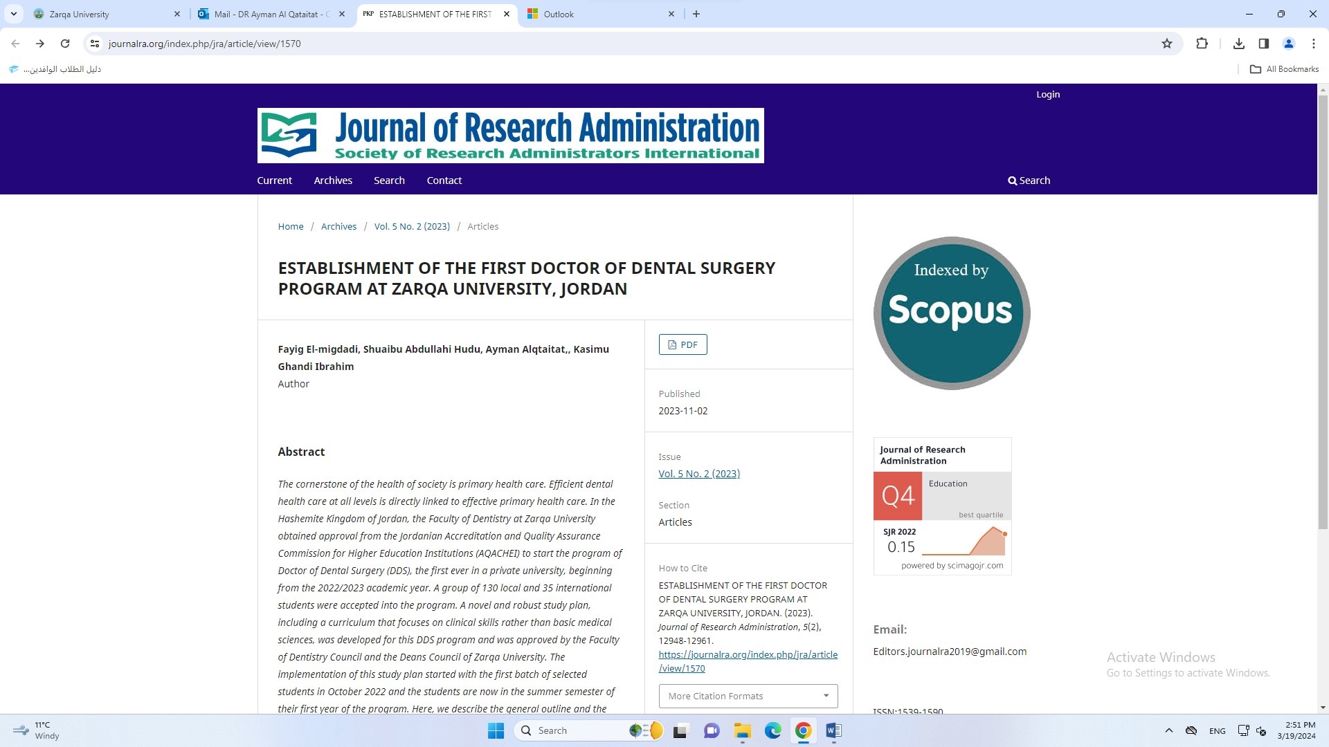 ضمن خطة كلية طب الأسنان في جامعة الزرقاء لتطوير البحث العلمي وتقديم أفضل الأبحاث التي تخدم العملية التعليمية والبحثية، تميزت الكلية في نشر ورقة علمية خاصة بمجلة علمية عالمية ومحكمة حول الخطة الدراسية لبرنامج دكتور في طب الأسنان بجامعة الزرقاء.