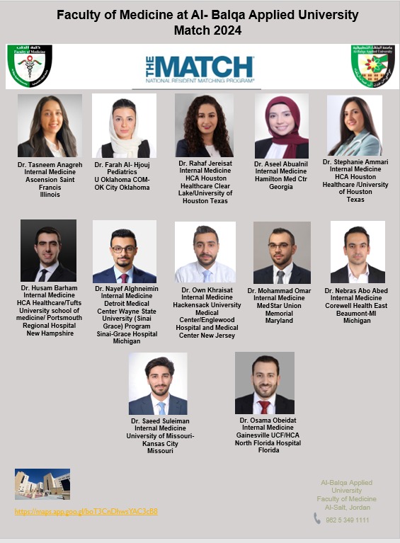 اثنا عشر طبيبا من خريجي طب البلقاء التطبيقية في قبولات التدريب السريري في برامج الإقامة في الولايات المتحدة الأمريكية