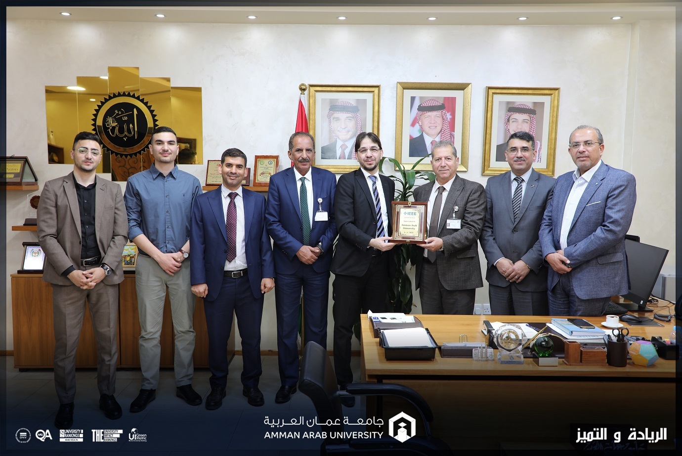 استقبل الأستاذ الدكتور محمد الوديان رئيس جامعة عمان العربية وفداً من الهيئة التنفيذية لمنظمة مهندسي الكهرباء والإلكترونيات IEEE / فرع الأردن يرافقهم الدكتور معتز ريالات رئيس فصل الروبوت والأتمته (RAS) / فرع الاردن و الطالب أحمد ابو دية عضو مجموعة (Sight/IEEE) وذلك بحضور كّل من: الدكتور حسام الحمد عميد كلية العلوم الحاسوبية والمعلوماتية و الدكتور أنور العساف عميد كليتي الهندسة و علوم الطيران في الجامعة ، والدكتور إسماعيل ياسين رئيس الجمعية العربية للروبوت والذكاء الإصطناعي و الطالب فخري التميمي من جامعة عمان العربية / عضو فخري في IEEE.