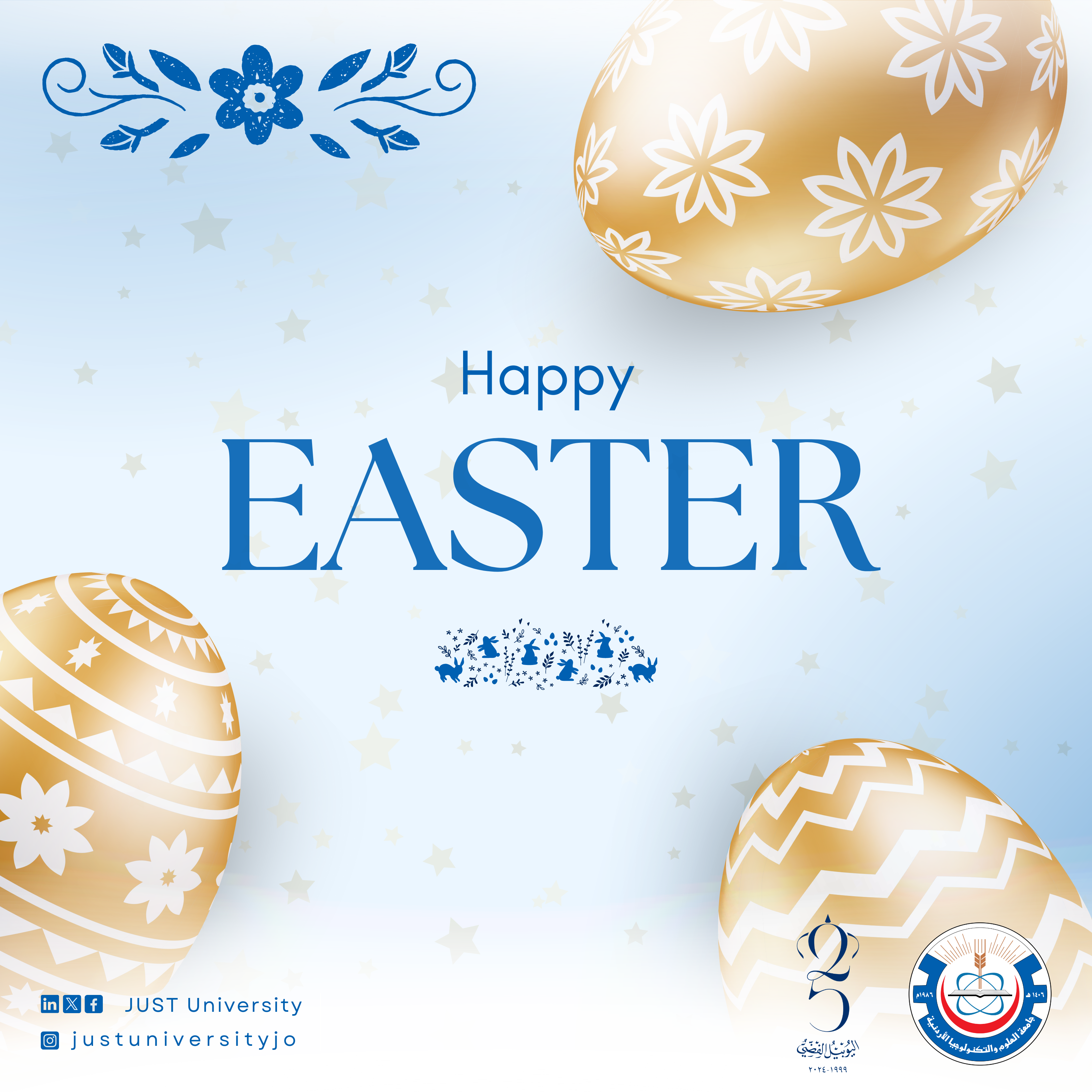 تتقدم أسرة جامعة العلوم والتكنولوجيا الأردنية ممثلة برئيسها الأستاذ الدكتور خالد السالم بأطيب التهاني وأصدق الأمنيات إلى أبناء وبنات الطوائف المسيحية من الهيئتين التدريسية والإدارية والطلبة بمناسبة عيد الفصح المجيد، سائلين المولى العلي القدير أن يعيد هذه المناسبة عليهم بالخير واليمن والبركات في ظل صاحب الجلالة الهاشمية الملك عبدالله الثاني ابن الحسين المعظم حفظه الله ورعاه، وولي عهده الأمين سمو الأمير الحسين بن عبدالله الثاني.