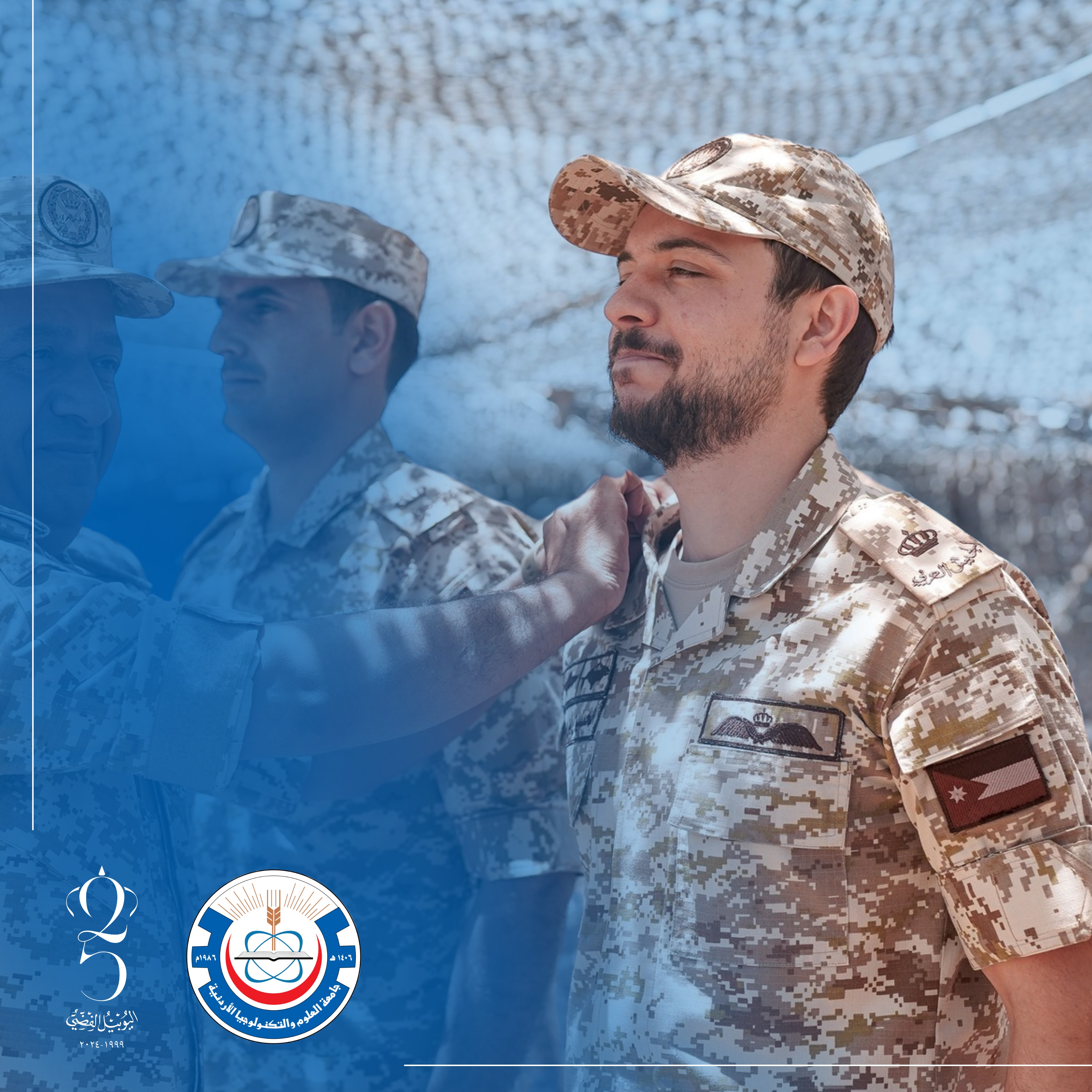 جامعة العلوم والتكنولوجيا الأردنية ممثلة برئيسها الأستاذ الدكتور خالد السالم وأعضاء الهيئتين التدريسية والإدارية والطلبة، ترفع إلى صاحب السمو الملكي الأمير الحسين بن عبدالله، ولي العهد، أسمى آيات التهنئة والتبريك، بصدور الإرادة الملكية السامية بالترفيع لرتبة رائد في القوات المسلحة الأردنية – الجيش العربي.