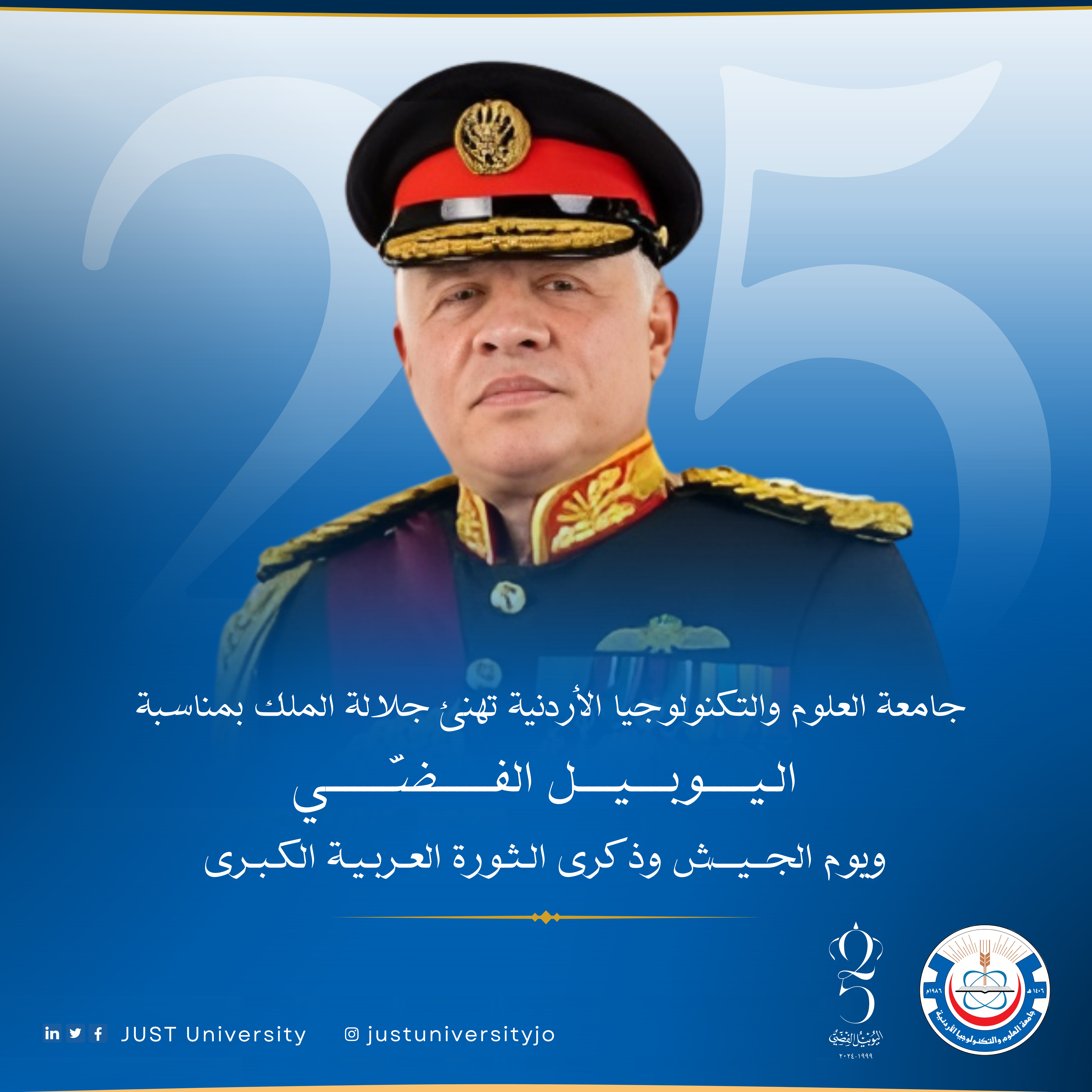 ترفع أسرة جامعة العلوم والتكنولوجيا الأردنية ممثلة برئيسها الأستاذ الدكتور خالد السالم، وأعضاء الهيئتين الأكاديمية والادارية، وطلبة الجامعة، إلى مقام حضرة صاحب الجلالة الهاشمية الملك عبدالله الثاني ابن الحسين المعظم، وسمو ولي العهد الأمير الحسين بن عبدالله أصدق المشاعر وخالص التهاني والتبريك بمناسبة اليوبيل الفضي لتولي جلالة الملك عبدالله الثاني سلطاته الدستوريَّة وذكرى الثورة العربية الكبرى ويوم الجيش.