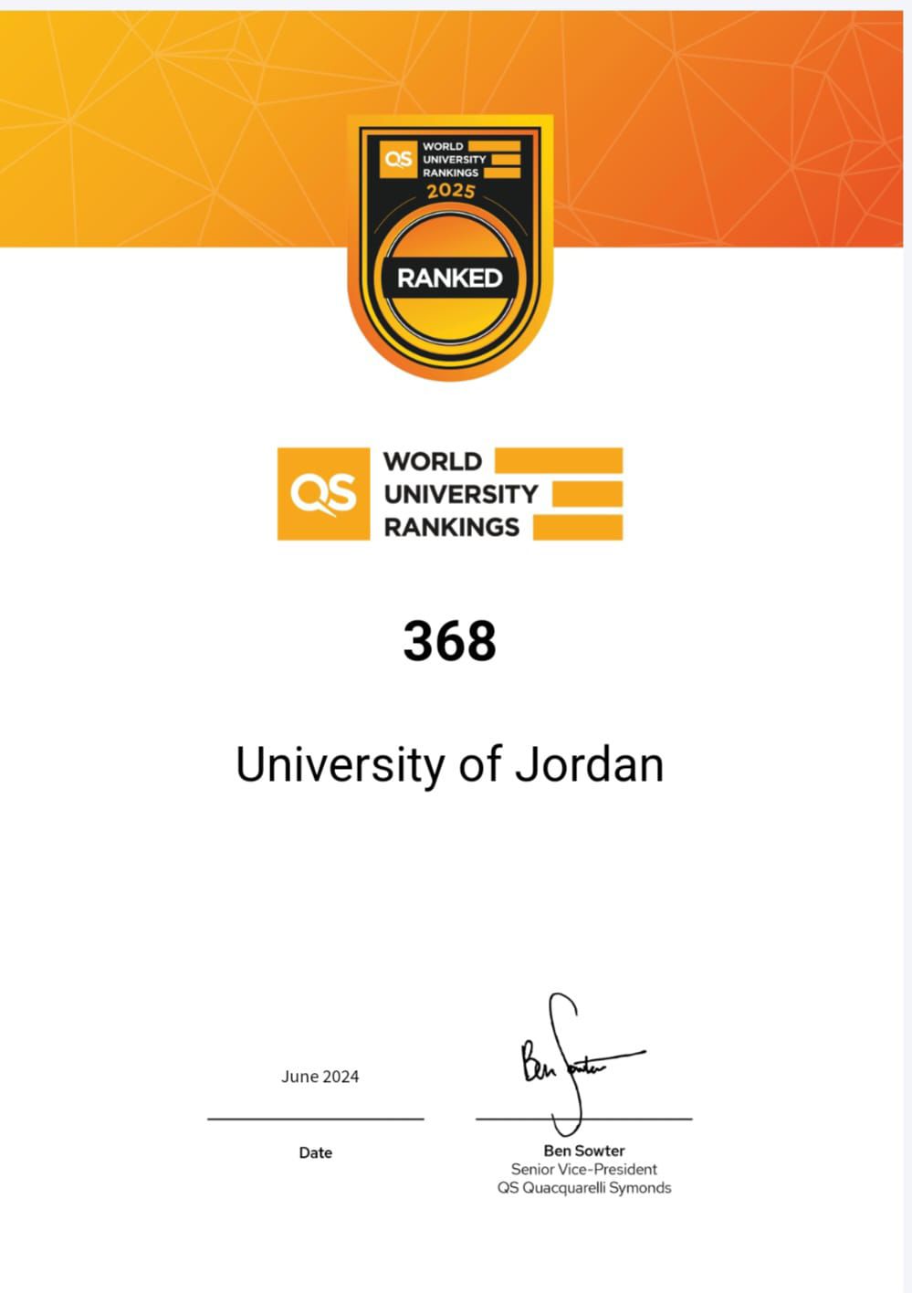 أخبار الجامعة الأردنية (أ ج أ) في تطور غير مسبوق، حلت الجامعة الأردنية في المرتبة 368 عالميا وفق تصنيف QS العالمي 2025.