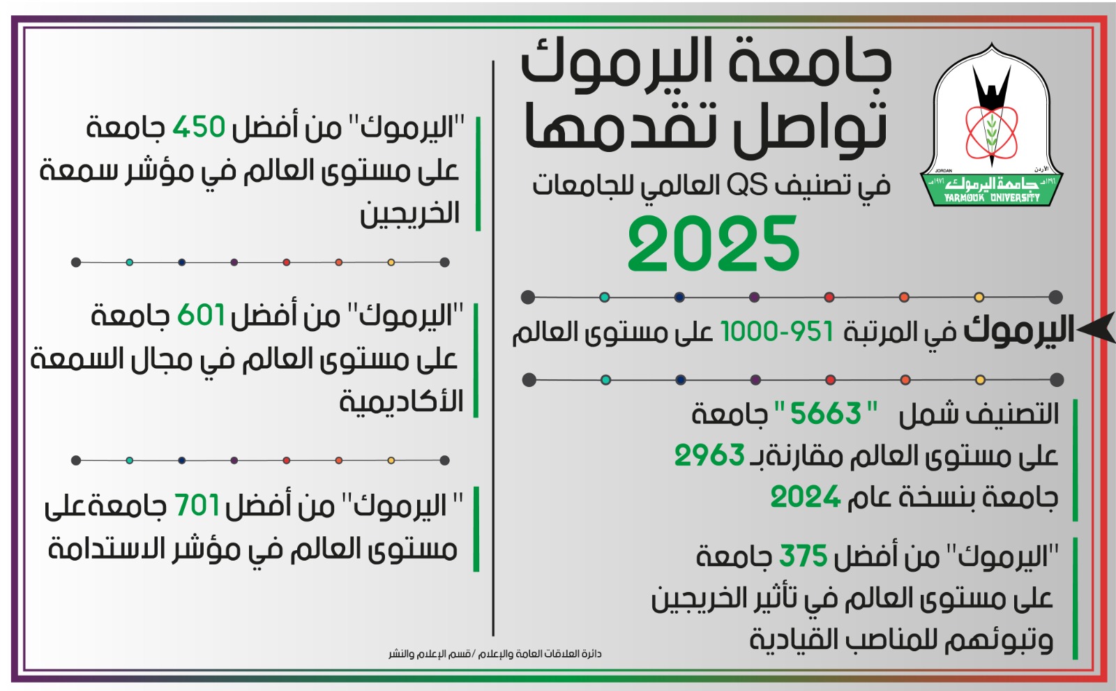 واصلت جامعة اليرموك تقدمها الملحوظ وللعام الثاني على التوالي في تصنيف "كيو اس" العالمي للجامعات في نسخته للعام 2025 لتصبح في المرتبة 951-1000 على مستوى العالم، من بين 5663 جامعة تم تقييمها مقارنة 2963 جامعة تم تقيمها بنسخة عام 2024.