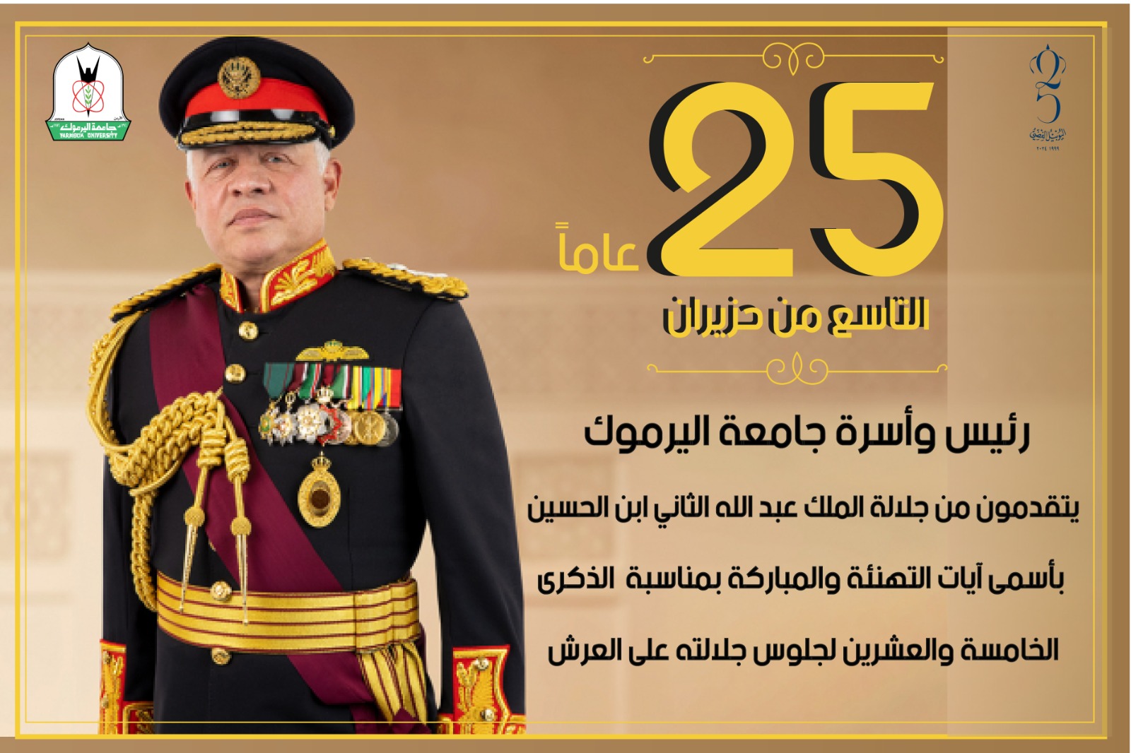رفع رئيس جامعة اليرموك الدكتور إسلام مسّاد، أسمى آيات التهاني المقرونة بأجمل عبارات الولاء إلى مقام جلالة الملك عبد الله الثاني، بمناسبة الاحتفالات الوطنية باليوبيل الفضي لتولي جلالته سلطاته الدستورية.