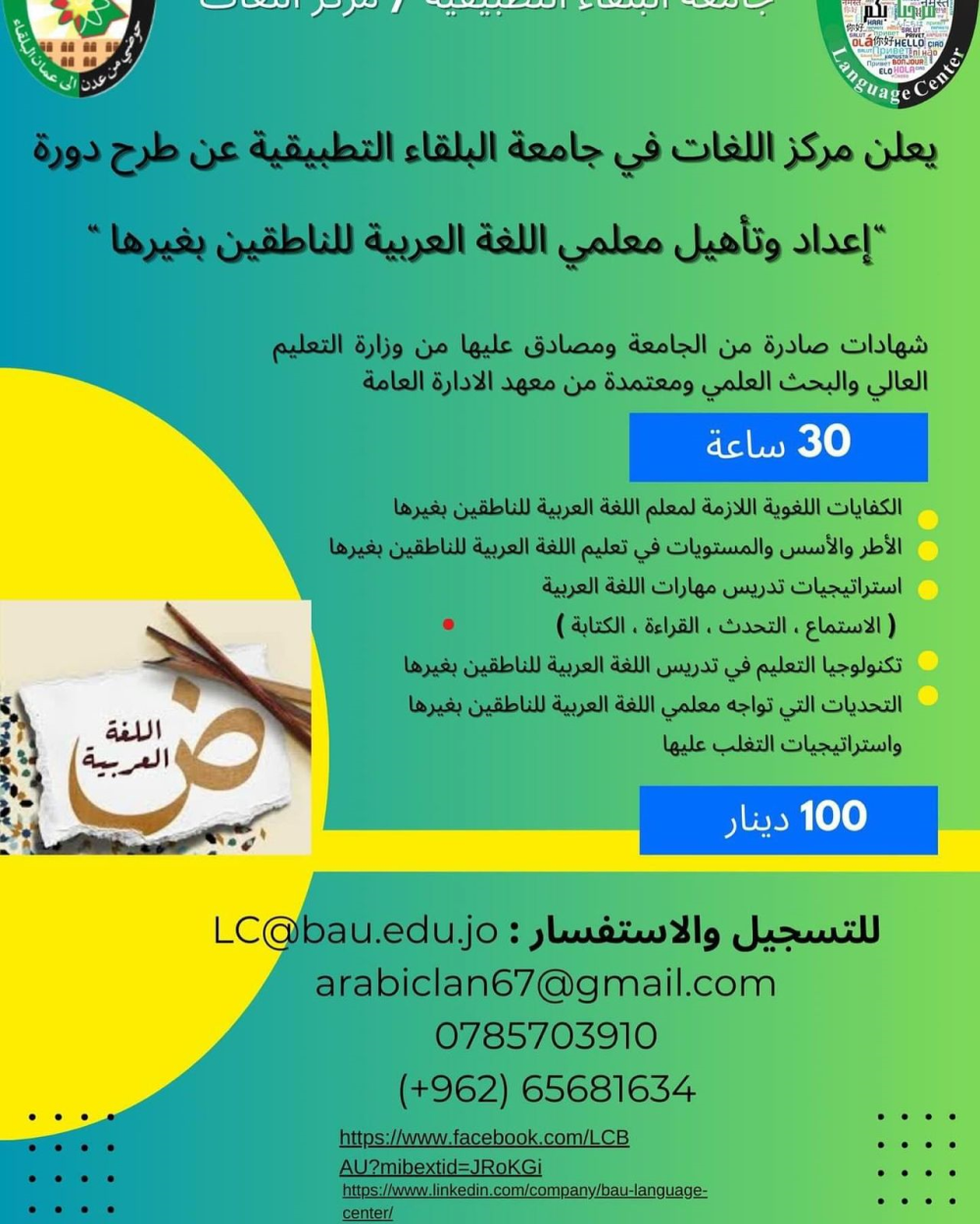 يعلن مركز اللغات في جامعة البلقاء التطبيقية عن طرح الدورة التأهيلية التطبيقية ( إعداد وتأهيل معلمي اللغة العربية للناطقين بغيرها )