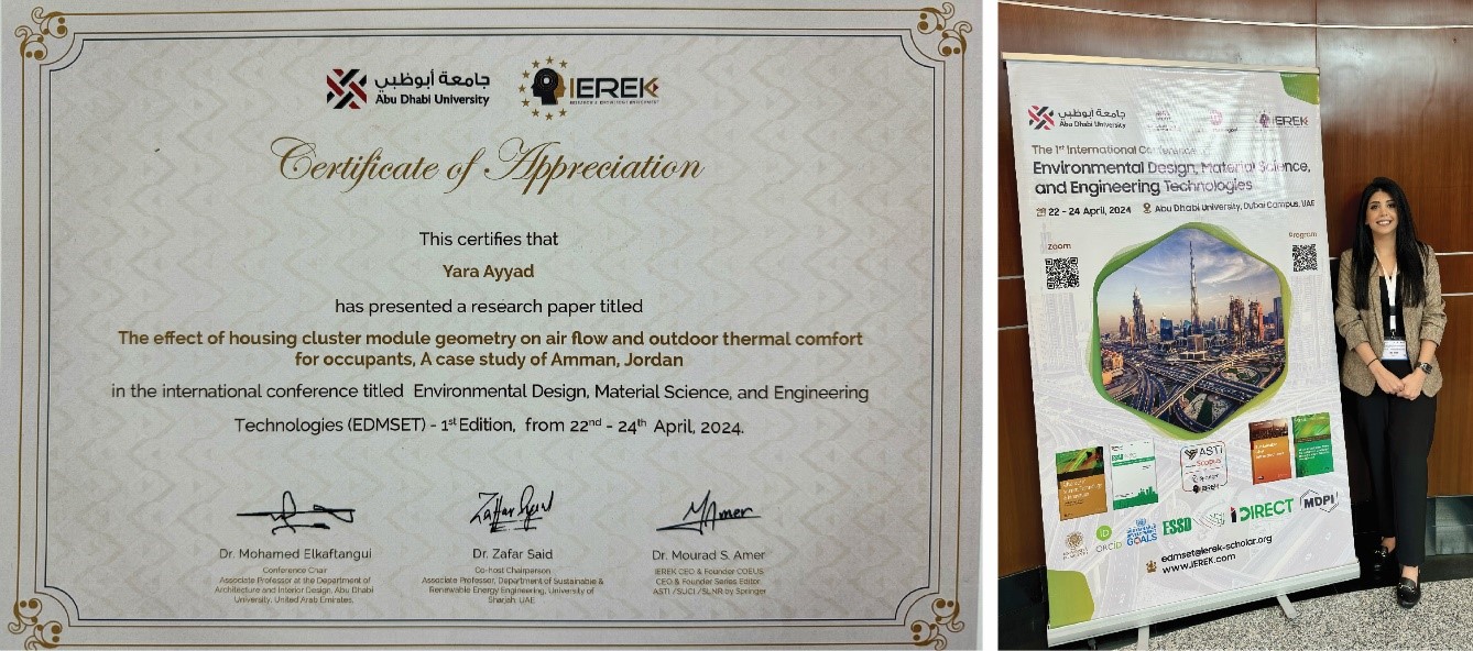 شاركت الدكتورة يارا عياد رئيسة قسم هندسة العمارة في كلية العمارة والتصميم / جامعة عمان الأهلية، في المؤتمر الدولي الذي أنعقد في جامعة أبو ظبي، بدولة الإمارات العربية المتحدة بعنوان: Environmental Design, Material Science, and Engineering Technology، وذلك يومي 22-24 /4/ 2024، وجاءت المشاركة عبارة عن ورقة بحثية موسومة بعنوان: The effect of housing cluster module geometry on air flow and outdoor thermal comfort for occupants, A case study of Amman, Jordan وسوف يتم نشر هذه الورقة البحثية في كتاب بعنوان: Advances in Science, Technology & Innovation، يُدرج في قاعدة البيانات العالمية سكوبس. وتأتي هذه المشاركة في إطار سياسة الانفتاح التي تنتهجها الكلية والجامعة على المؤسسات الأكاديمية على المستوى الإقليمي والدولي، وتعزيز الشراكات العلمية التطبيقية في مجالات الهندسة المعمارية، بما يتماشى مع رؤية الجامعة وسياستها وقيمها الجوهرية.
