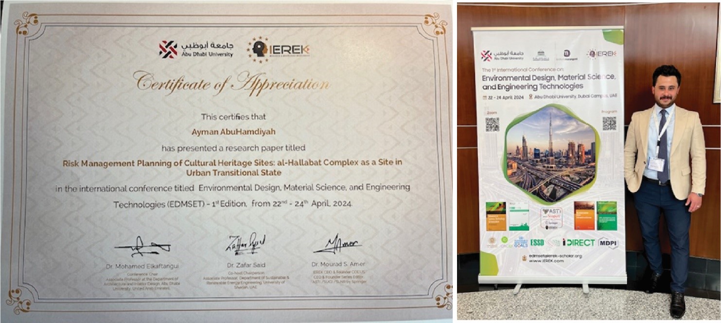 شارك المهندس أيمن أبو حمدية عضو الهيئة التدريسية في قسم هندسة العمارة في كلية العمارة والتصميم / جامعة عمان الأهلية، في المؤتمر الدولي الذي أنعقد في جامعة أبو ظبي، بدولة الإمارات العربية المتحدة بعنوان: Environmental Design, Material Science, and Engineering Technology، وذلك يومي 22-24 /4/ 2024 وجاءت المشاركة عبارة عن ورقة بحثية موسومة بعنوان: Cultural Heritage Sites: al-Hallabat Complex as a Site in Urban Transitional State وسوف يتم نشر هذه الورقة البحثية في كتاب بعنوان: Advances in Science, Technology & Innovation، يُدرج في قاعدة البيانات العالمية سكوبس. وتأتي هذه المشاركة في إطار سياسة الانفتاح التي تنتهجها الكلية والجامعة على المؤسسات الأكاديمية على المستوى الإقليمي والدولي، وتعزيز الشراكات العلمية التطبيقية في مجالات الهندسة المعمارية، بما يتماشى مع رؤية الجامعة وسياستها وقيمها الجوهرية.