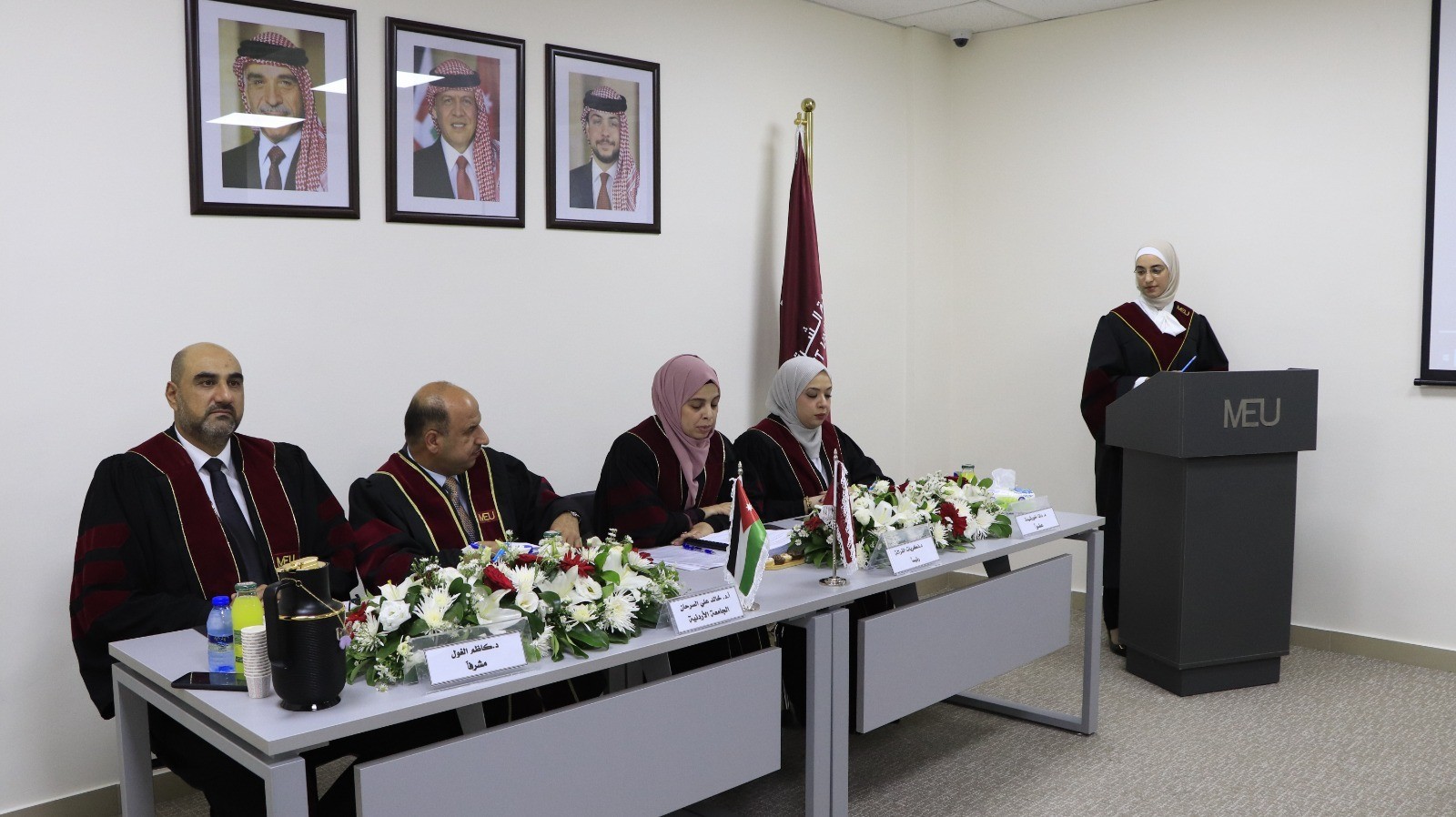 وتألفت لجنة المناقشة من الدكتورة ذكريات القرالة رئيساً والدكتور كاظم الغول مشرفاً، والدكتورة دانا اخورشيدة عضواً والأستاذ الدكتور خالد السرحان عضوا من خارج الجامعة.