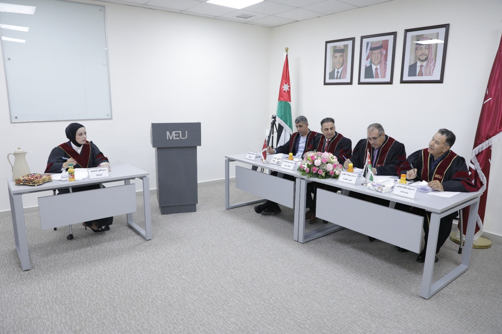وتألفت لجنة المناقشة من الدكتور ايمن الرفوع رئيسًا، الدكتور بلال الرواشدة مشرفاً، والدكتور محمد الشباطات عضوًا، الأستاذ الدكتور صايل المومني عضواً من خارج الجامعة.
