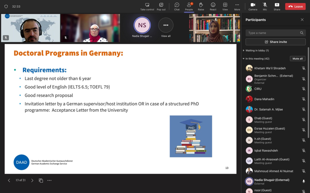 فضمن جهود الجامعة في توفير أفضل الفرص لأبنائها الطلبة وتعزيز آفاق التعاون الدولي، نظمت دائرة المشاريع الدولية في وحدة التعاون والعلاقات الدولية وبالتعاون مع مؤسسة DAAD الألمانية - ورشة عمل عن طريق تطبيق " Teams" ، وذلك يوم الأثنين الموافق 7/8/2023 ، للتعريف بالمنح الدراسية لبرامج الماجستير والدكتوراه والأبحاث في الجامعات الألمانية، حيث قدم مدير مؤسسة الداد الألمانية في الأردن السيد بنجامين شمالنج تعريفاً عن مؤسسة الداد والبرامج والمشاريع التي تطلقها المؤسسة، وبدورها قدمت مسؤولة برامج الدراسات العليا في مؤسسة الداد الألمانية السيدة ناديا شقير شرحاً تفصيلياً عن برامج الدراسات العليا، وعن المنح التي تقدم عن طريق مؤسسة DAAD لتشمل برامج الماجستير والدكتوراه والابحاث بما فيها شروط الحصول على المنح وكيفية تقديم الطلبات والوثائق المطلوبة ومواعيد التقديم.