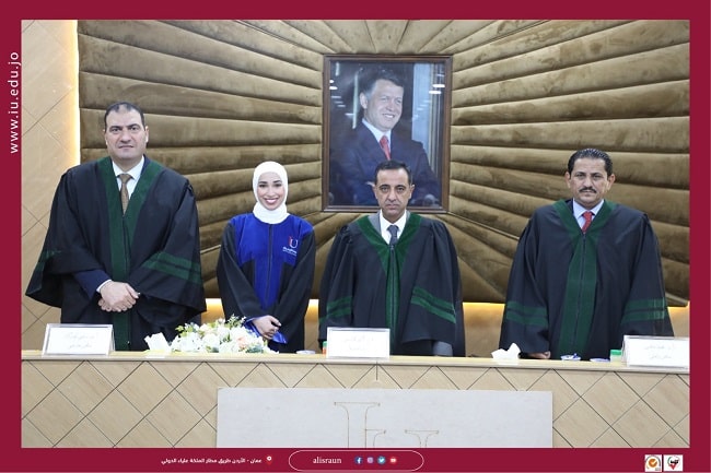 وتكونت لجنة المناقشة من الأستاذ الدكتور أكرم الفايز(مشرفاً ورئيساً) والدكتور محمد الشاهين (مناقشاً داخلياً) والأستاذ الدكتور رامي أبو ركبة (مناقشاً خارجياً) من جامعة عمان الأهلية.