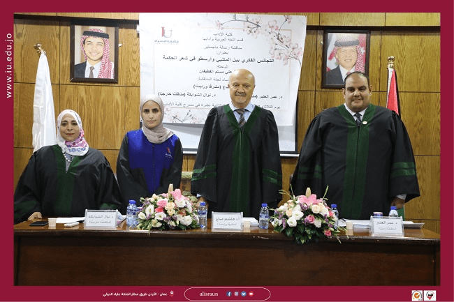 ناقشت الطالبة ردينه علي القطيفان، من كلية الآداب بجامعة الإسراء رسالة الماجستير الخاصة بها والموسومة ب" التجانس الفكري بين المتنبي وآرسطو في شعر الحكمة".
