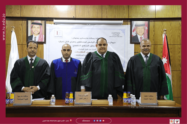 ناقش الطالب عدي يحيى الفلاحات من كلية الآداب بجامعة الإسراء رسالة الماجستير الخاصة به والموسومة ب “ ديوان عشيات وادي اليابس لمصطفى وهبي التل (عرار) دراسة وفق المنهج النفسي.